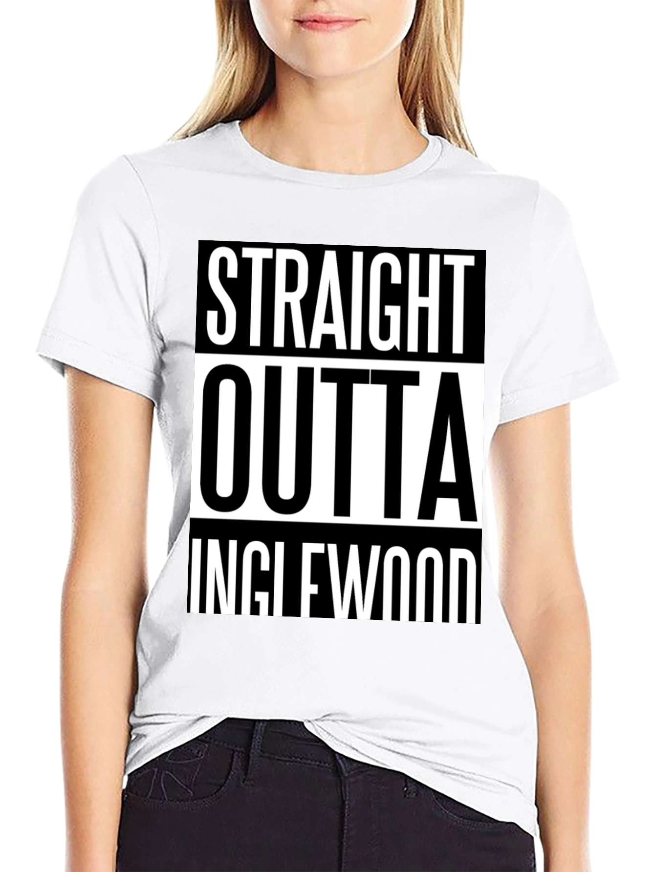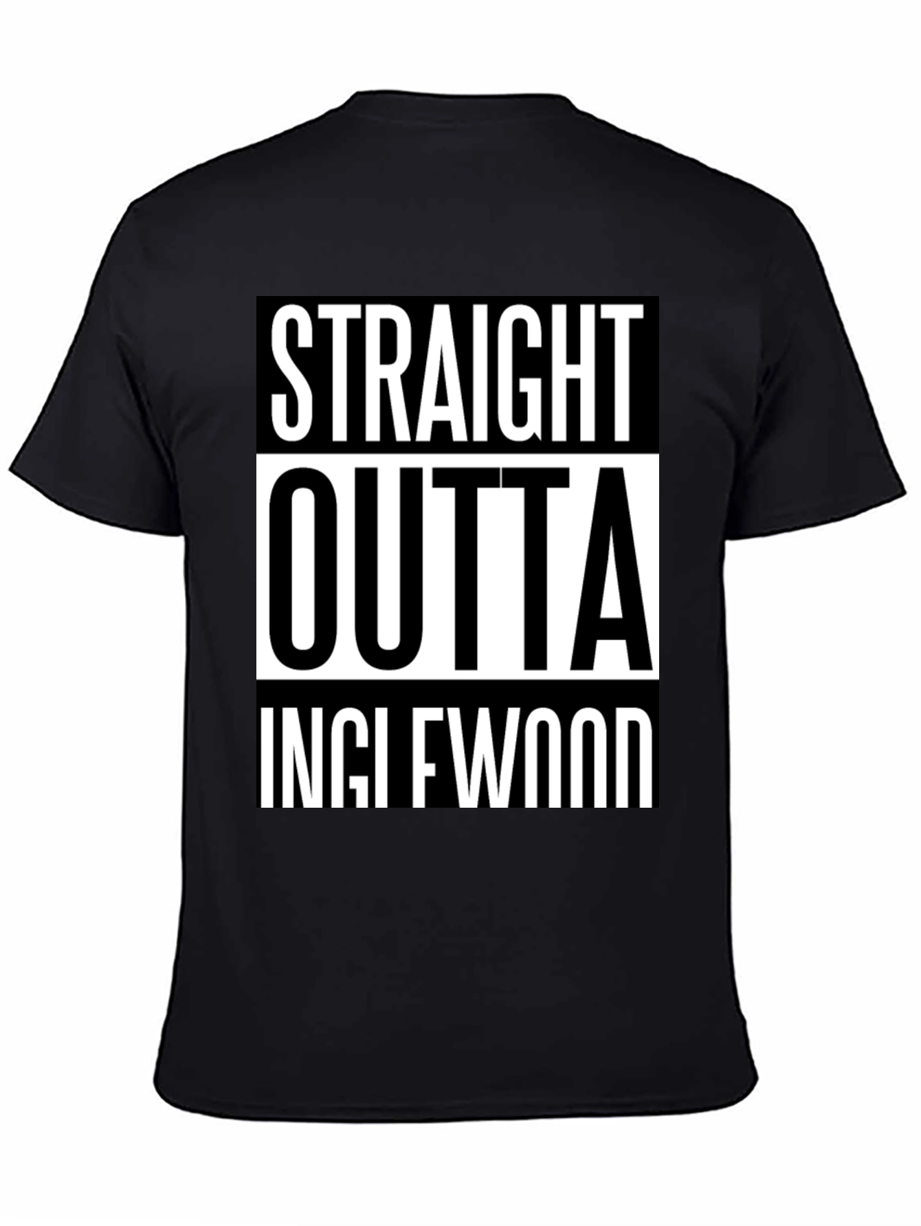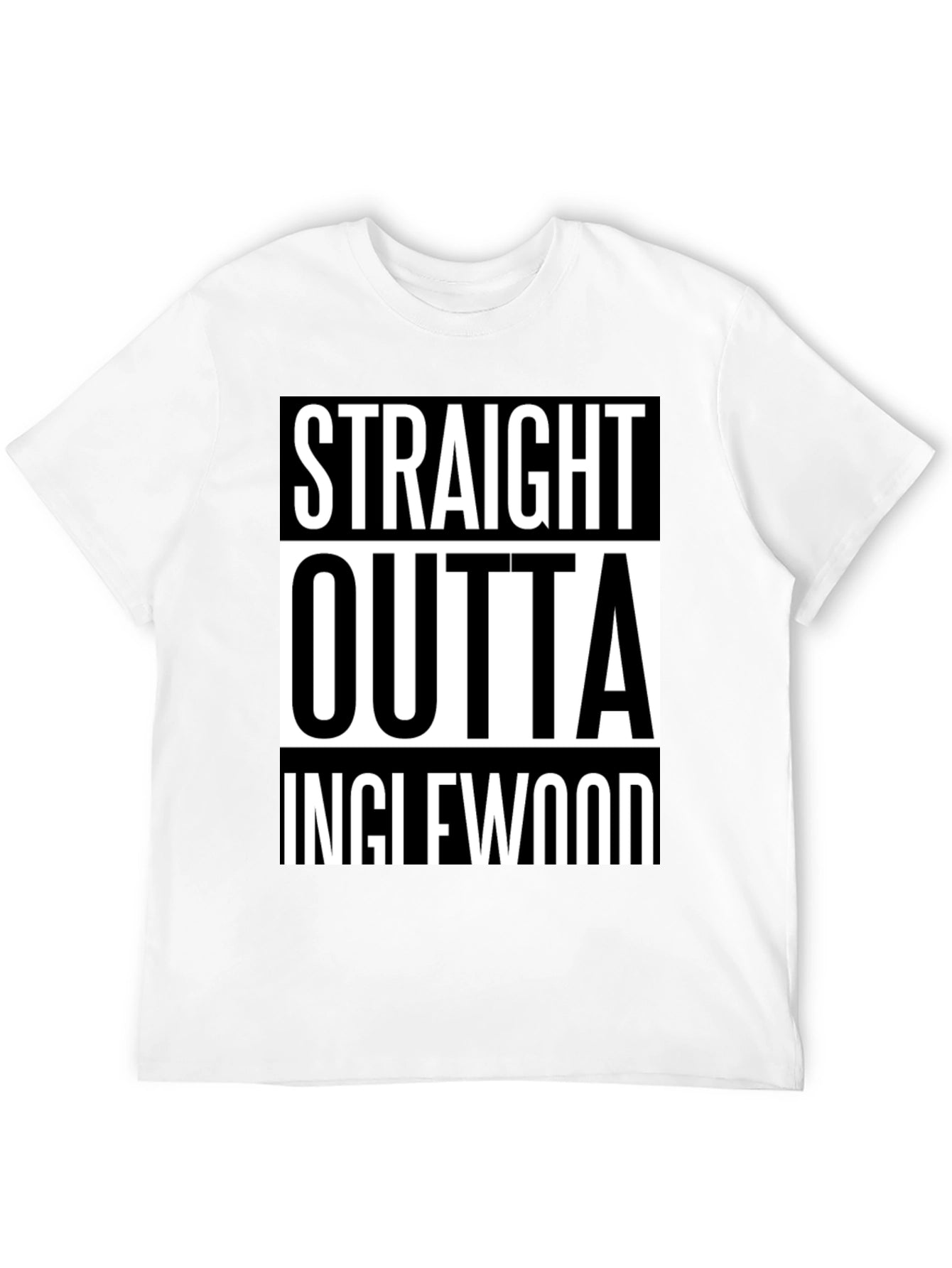 Show your Inglewood pride with this bold black t-shirt. The shirt features the phrase "STRAIGHT OUTTA INGLEWOOD" in a clean, impactful white font within black boxes, creating a striking visual contrast. Made from a comfortable-looking fabric, this tee is perfect for casual wear, showing off your hometown spirit, or as a unique gift. The classic crew neck and short sleeves offer a relaxed fit, making it ideal for everyday wear. Make a statement and represent Inglewood in style!