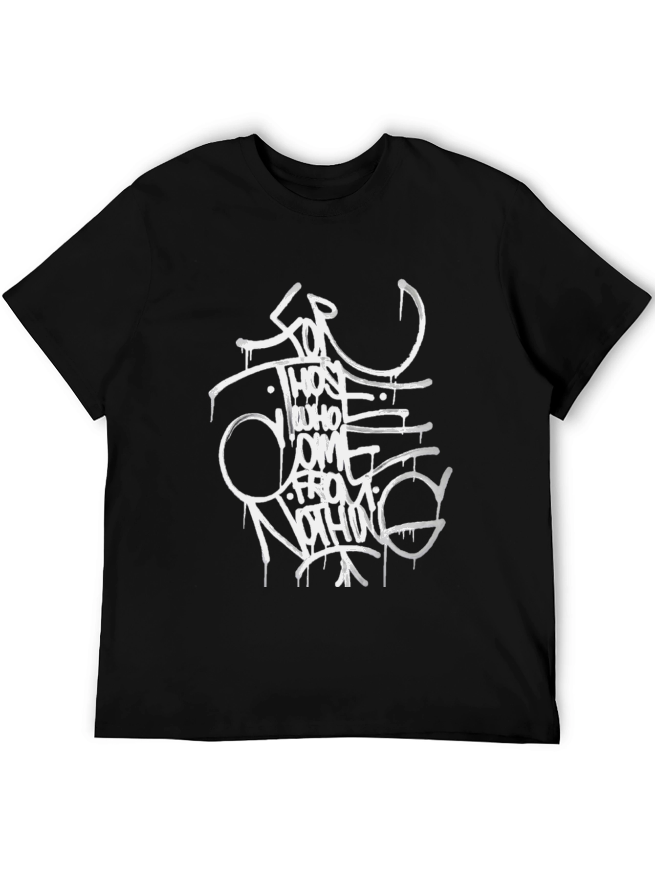 Make a statement with this bold black tee. Featuring edgy white graffiti-style graphics across the chest, this shirt is sure to turn heads. The artwork spells out "FOR THOSE WHO COME FROM NOTHING" in unique, artistic lettering. Made from comfortable cotton material, it's perfect for casual wear, street style, or expressing your individuality. Ideal for concerts, urban outings, or just lounging in style. A must-have addition to any streetwear enthusiast's wardrobe. The eye-catching design and comfortable fit make this a standout piece.