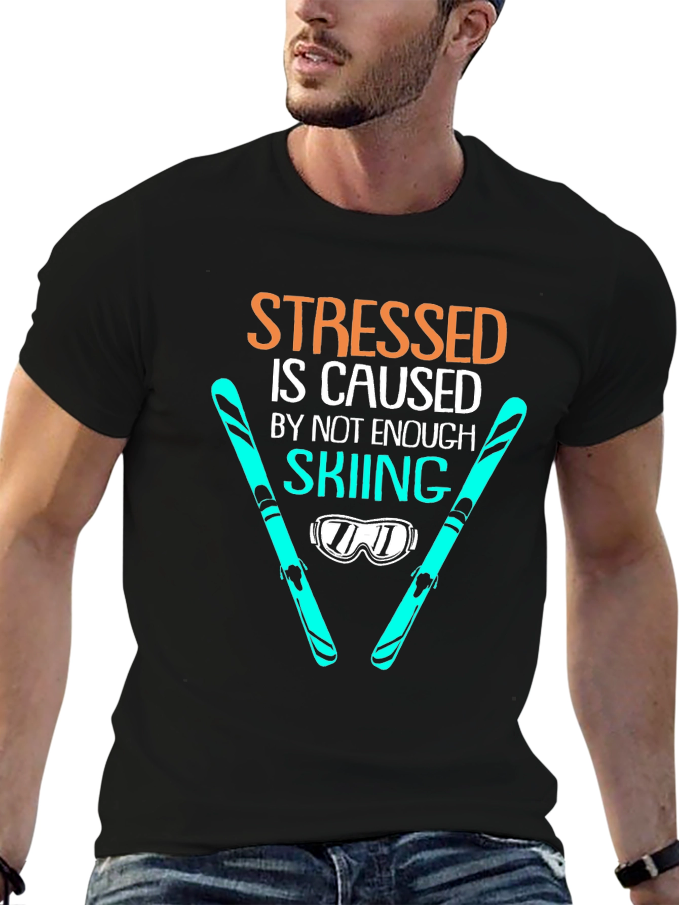 This stylish black t-shirt features a playful graphic design perfect for ski enthusiasts. The design incorporates the text "STRESSED IS CAUSED BY NOT ENOUGH SKIING" in a combination of orange and white lettering, accompanied by an illustration of two turquoise skis and ski goggles. Made from a comfortable, breathable fabric, this tee is ideal for casual wear, trips to the ski resort, or lounging at home. Show off your passion for skiing with this eye-catching t-shirt, a must-have for anyone who knows the best remedy for stress is hitting the slopes. It's also a great gift for the skier in your life!