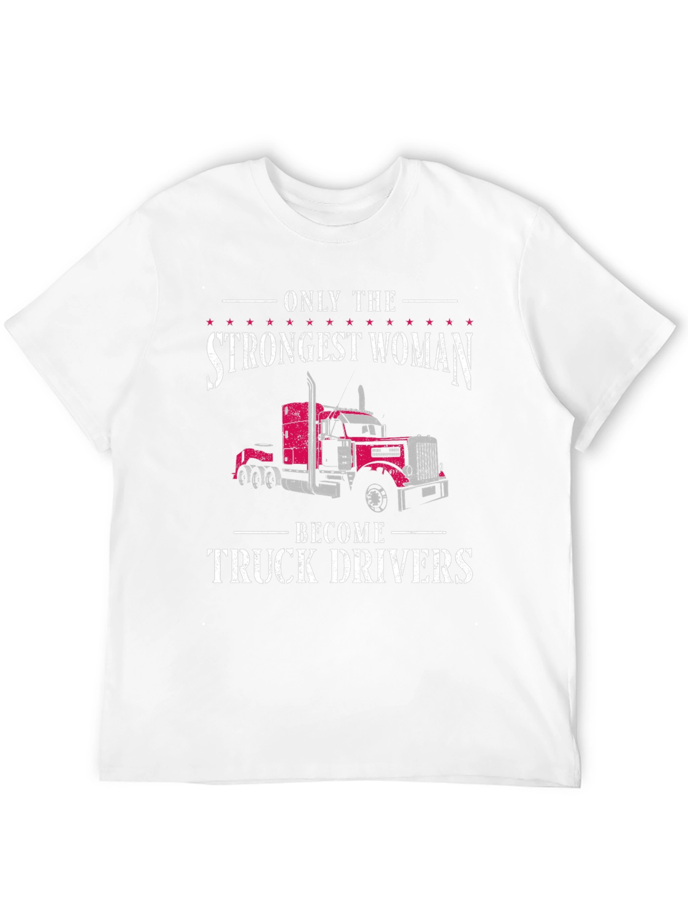 Show off your strength and pride with this bold statement t-shirt. Made from a comfortable black fabric, this tee features a striking design with a classic semi-truck and the words "Only the Strongest Woman Become Truck Drivers" in a distressed white font. The design also incorporates subtle star details. This shirt is perfect for female truck drivers who want to showcase their passion and resilience, or for anyone who admires their strength. Wear it casually or while on the road – either way, you'll make a statement with this unique and empowering t-shirt.