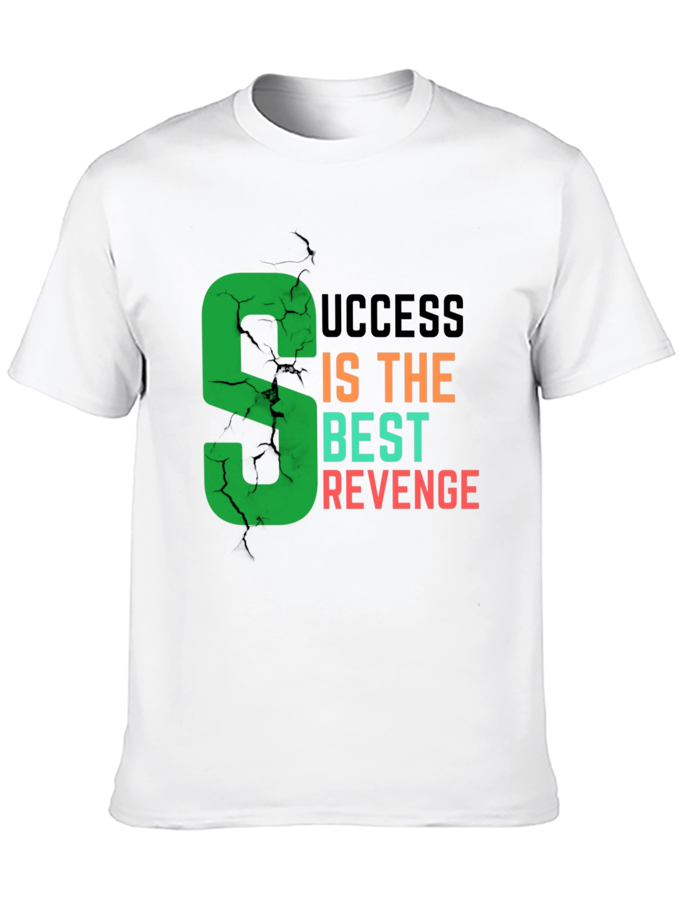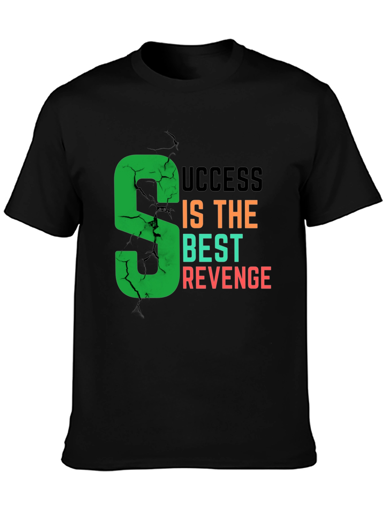 Show the world your ambition with this stylish black t-shirt. The bold graphic features a cracked-effect green letter 'S' leading into the statement "Success Is The Best Revenge" in dark gray, orange, and red fonts. Crafted from comfortable fabric, this tee offers a relaxed fit for everyday wear. Whether you're hitting the gym or heading out for a casual hangout, this shirt will keep you comfortable and motivated. The unique design is perfect for those who are driven and ready to conquer any challenge. It is a great addition to any wardrobe. Wear it with pride and let your success do the talking! Get yours today.