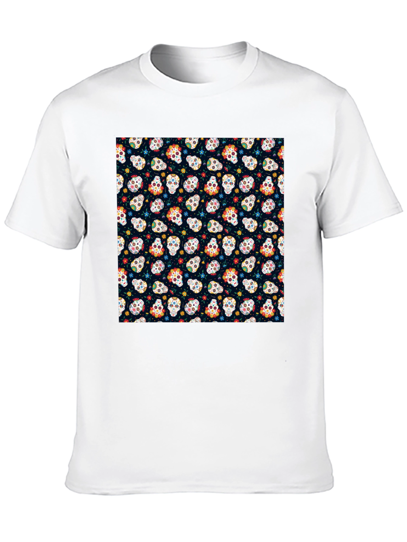 Embrace the vibrant spirit of Día de los Muertos with this eye-catching T-shirt. Featuring an all-over print of colorful sugar skulls and flowers, this tee is perfect for adding a festive touch to your wardrobe. Made from soft, breathable cotton, it offers all-day comfort and a classic fit. Whether you're celebrating Halloween, attending a cultural event, or simply expressing your unique style, this T-shirt is sure to turn heads. Pair it with jeans or shorts for a casual look, or dress it up with a blazer for a bolder statement. Add a pop of color and cultural flair to your everyday wear!