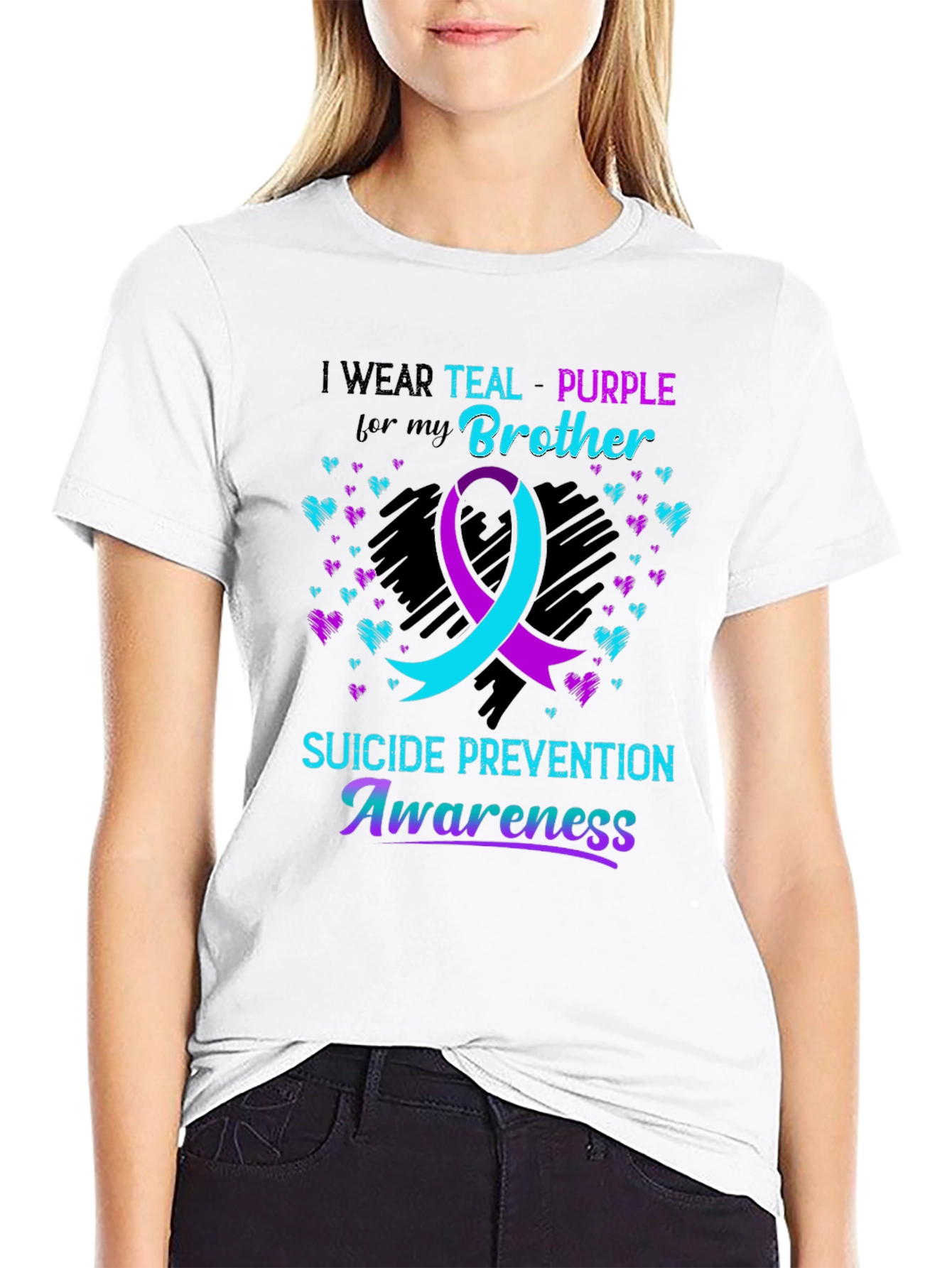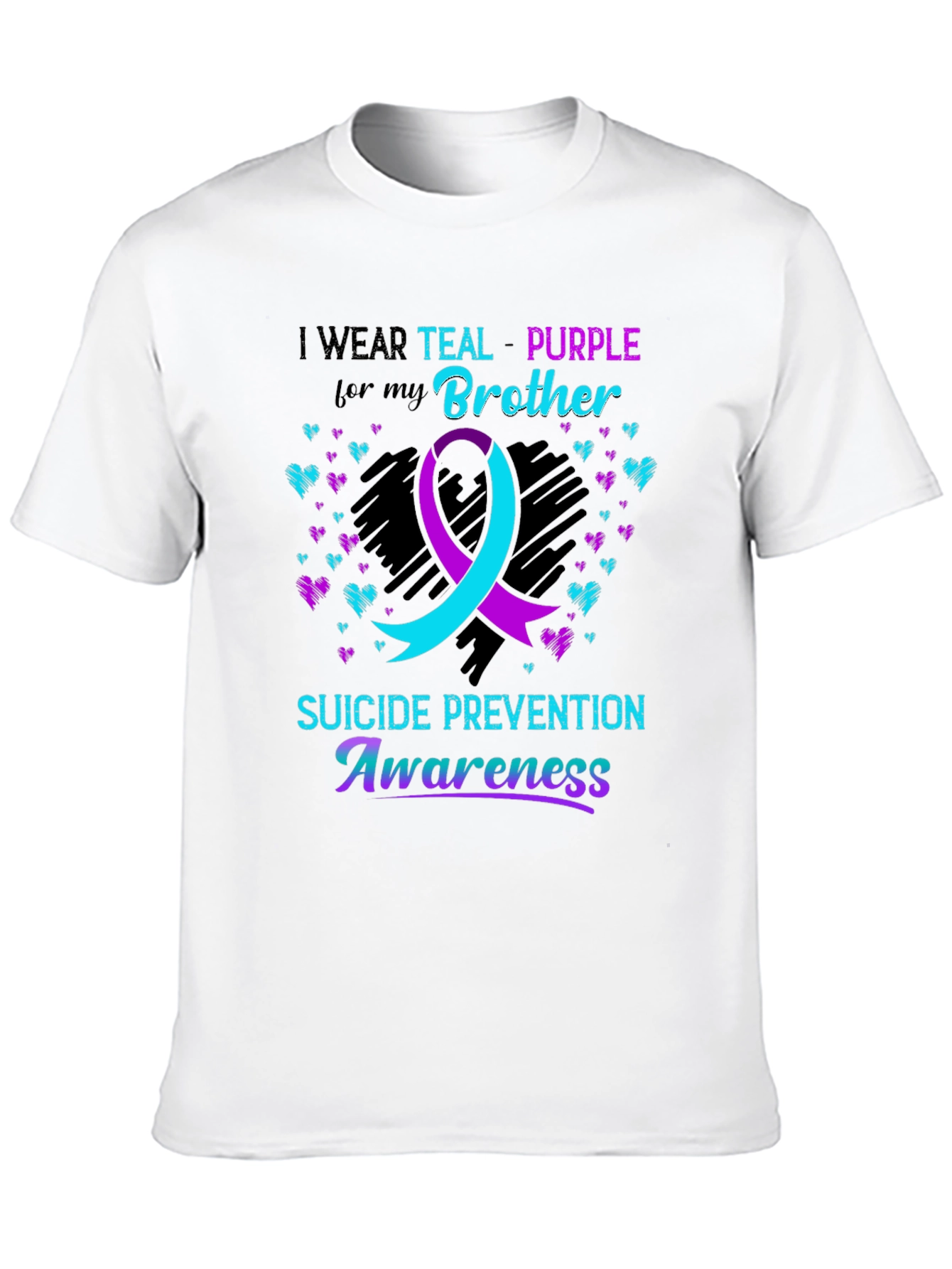 Show your support with this Suicide Prevention Awareness T-shirt. The black tee features a striking teal and purple design, incorporating a ribbon and heart accents. It states, 'I WEAR TEAL-PURPLE for my Brother', with 'SUICIDE PREVENTION Awareness' boldly displayed. The message promotes an important cause with a stylish design. Made from comfortable, breathable fabric, this shirt is perfect for awareness events, casual wear, or showing solidarity. A meaningful way to advocate for mental health and honor your brother.