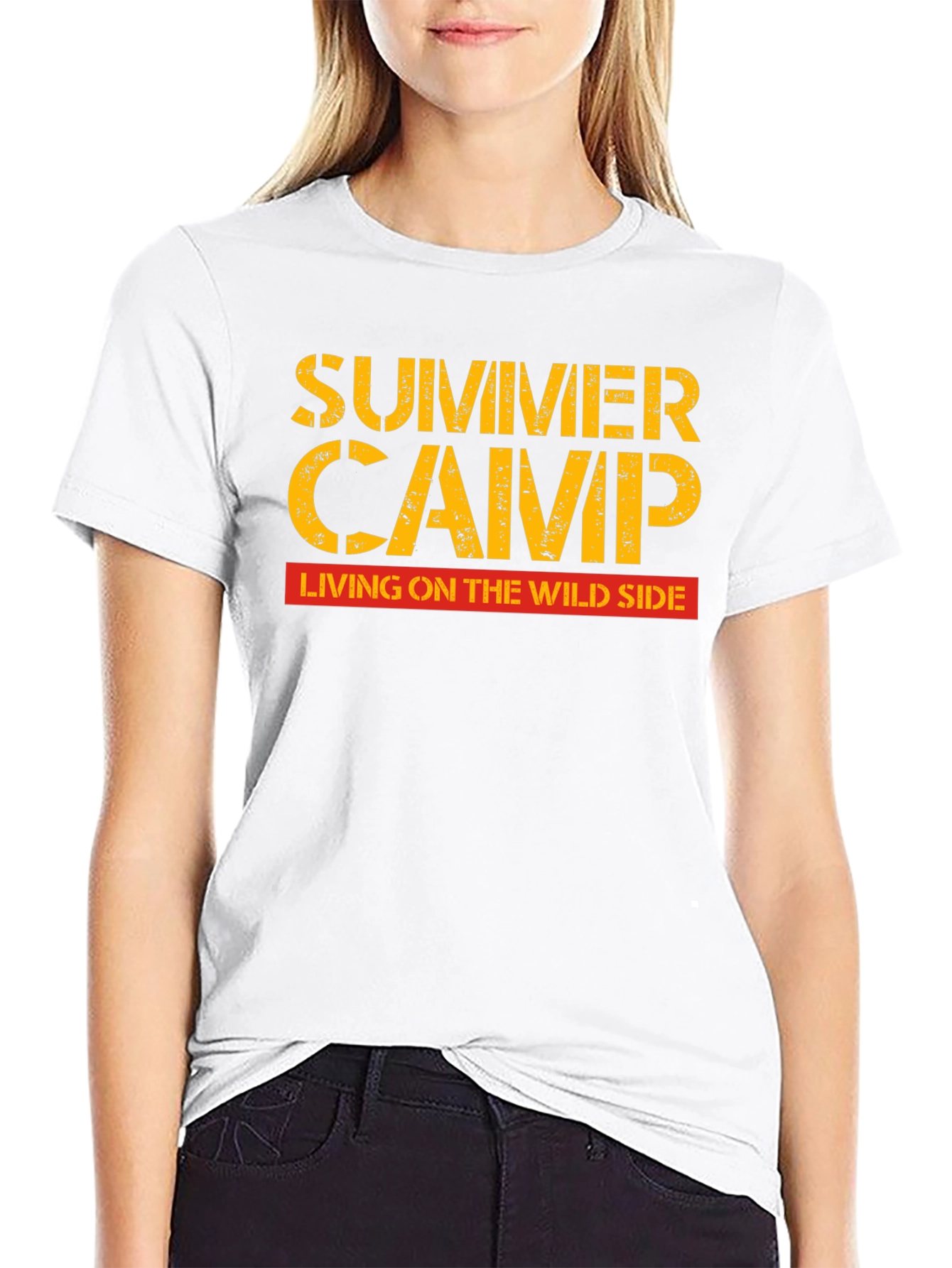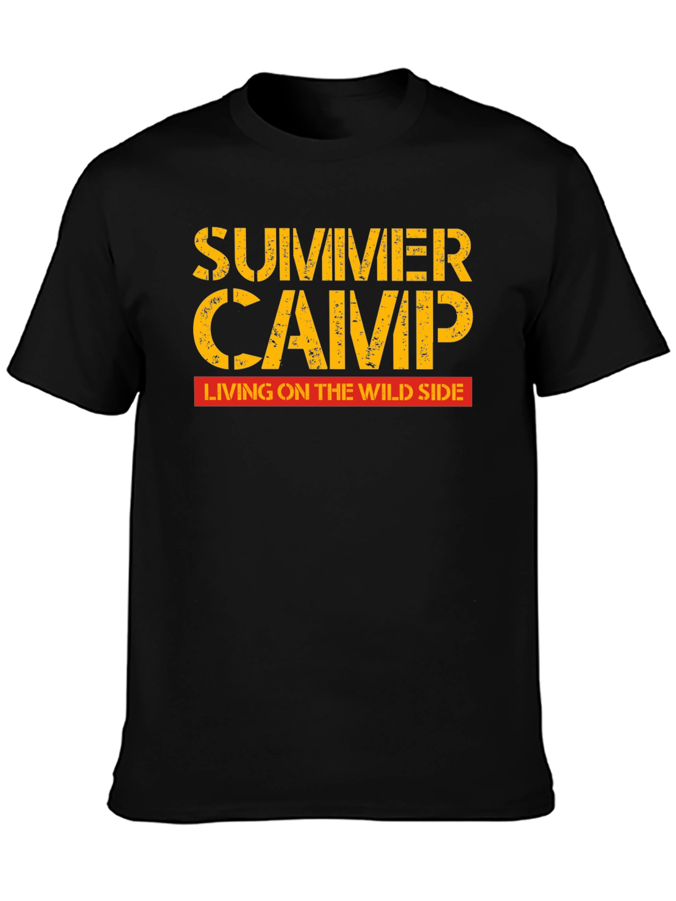 Show your summer camp spirit with this stylish black t-shirt! Featuring a bold "SUMMER CAMP" print in a vibrant yellow, this tee makes a statement. Below, a red banner proclaims "LIVING ON THE WILD SIDE," adding a touch of adventure to the design. Made from a comfortable material, this shirt is perfect for casual wear. Whether you're reliving camp memories or just embracing the carefree summer vibe, this tee is a great choice. Get ready for some fun in the sun!