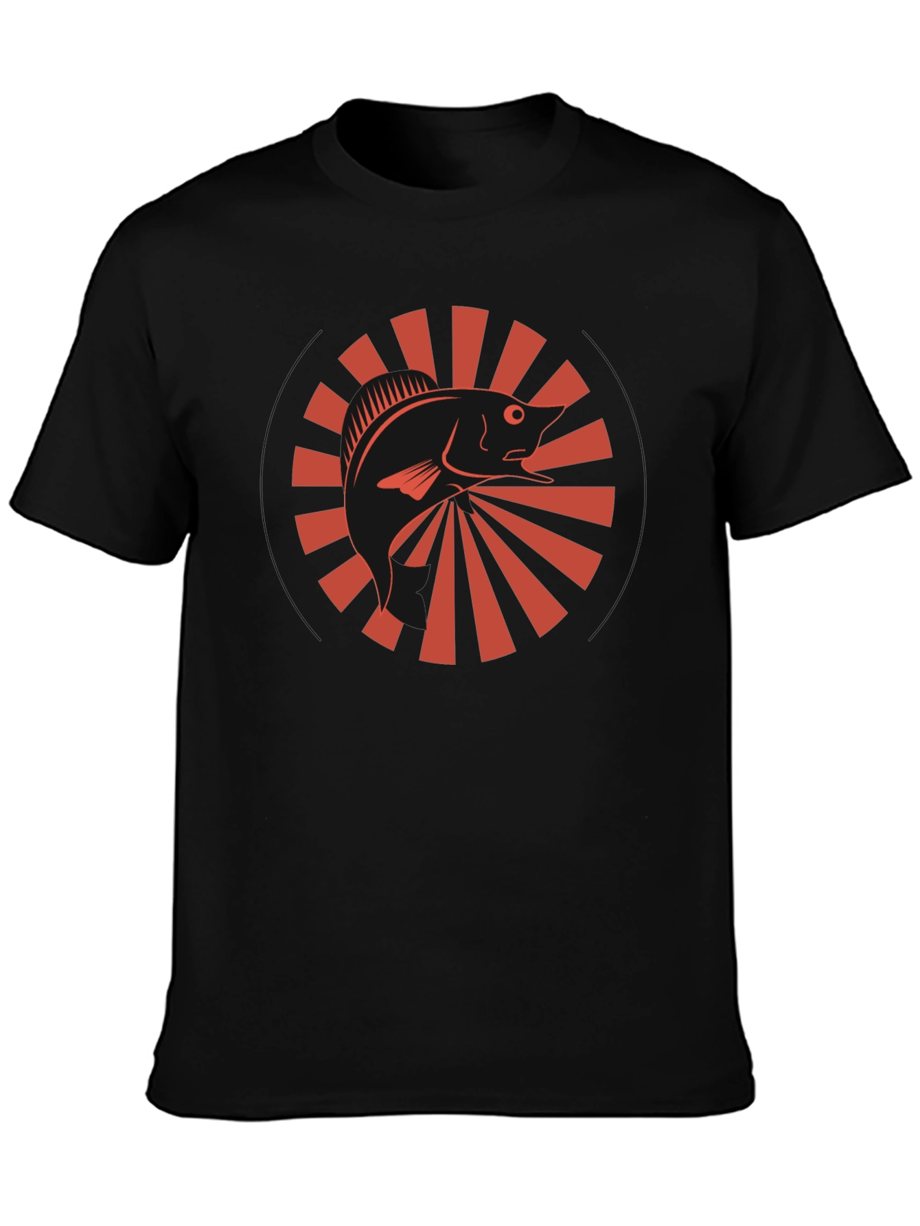 Show off your love for fishing with this eye-catching graphic tee! Featuring a unique red sunburst design with a stylized fish silhouette at the center, this black t-shirt is sure to turn heads. Made from comfortable, breathable fabric, this tee is perfect for casual wear, fishing trips, or everyday adventures. The striking graphic is ideal for expressing your personality and interests. Whether you're hitting the lake or just hanging out with friends, this shirt is a comfortable and stylish choice. Grab yours today and make a statement!