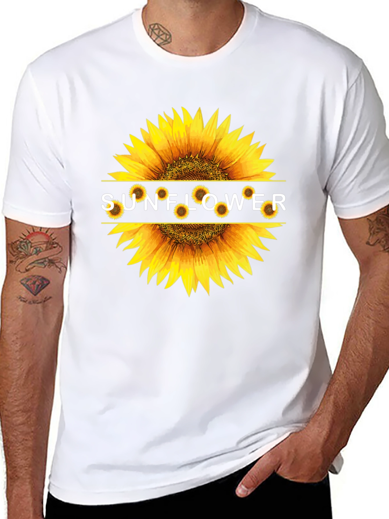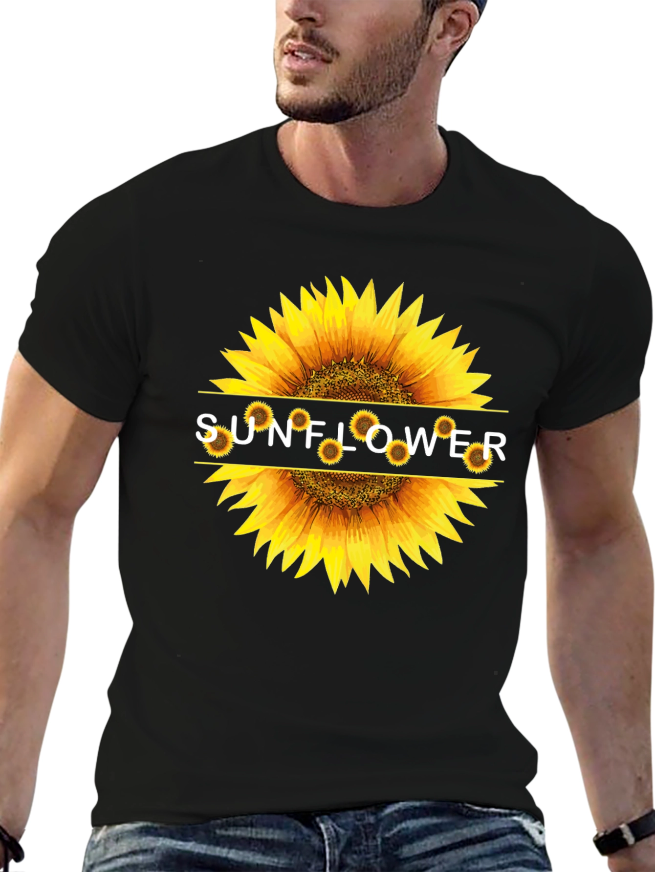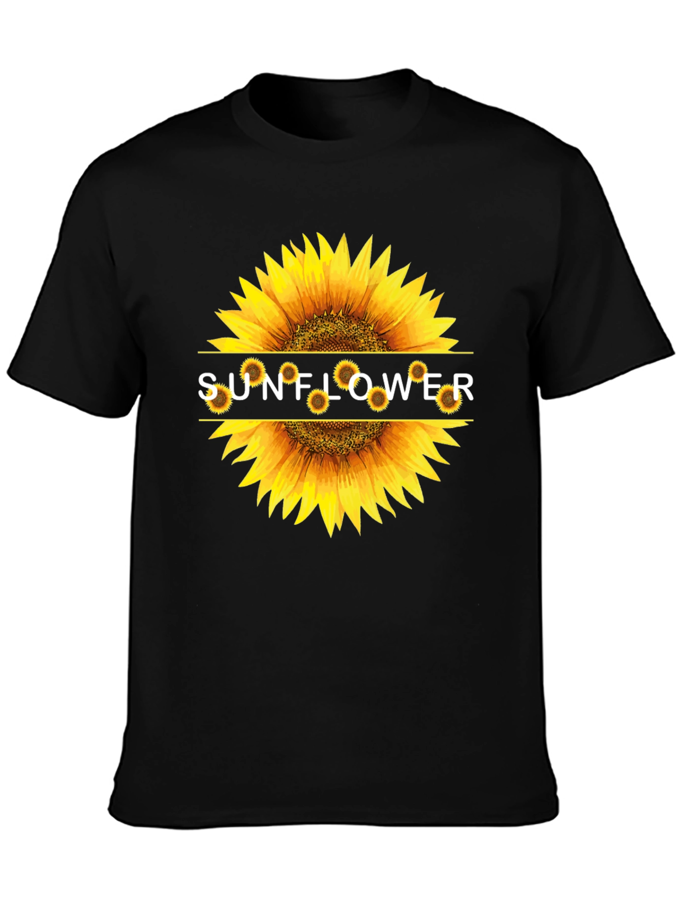 This classic black t-shirt features a striking sunflower graphic print on the chest. The vibrant sunflower design is bold and eye-catching, making it a standout piece. Made from a soft and comfortable fabric, this t-shirt is perfect for everyday wear. Its casual style makes it ideal for pairing with jeans, shorts, or even a skirt. Show off your love for nature with this unique and stylish tee! A great gift for yourself or any sunflower lover. The design incorporates the word 'SUNFLOWER'.