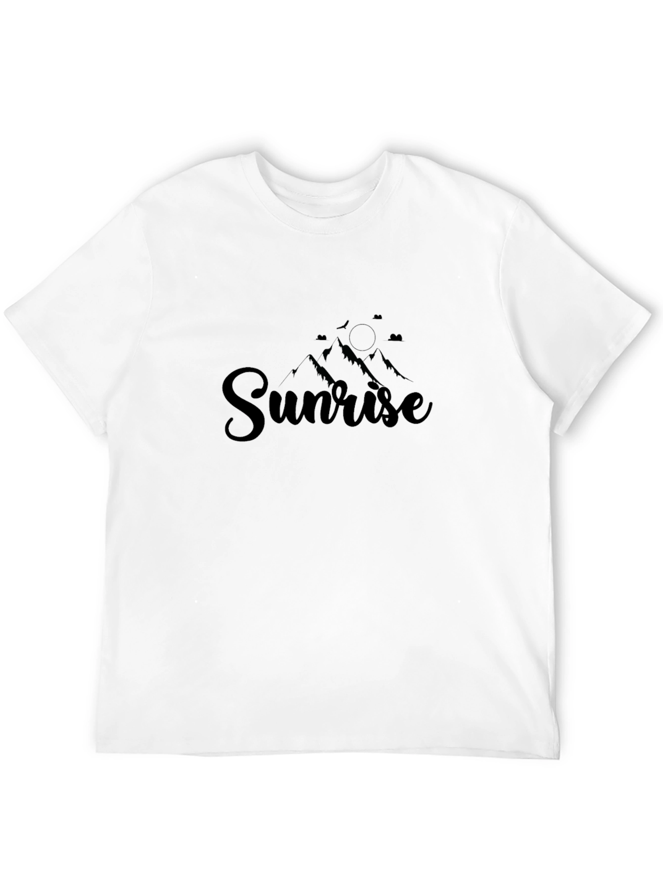 Embrace nature's beauty with this stylish black t-shirt featuring a unique "Sunrise" mountain graphic. The design showcases a scenic mountain range with a rising sun, perfect for outdoor enthusiasts. Made from soft, breathable fabric, this tee ensures all-day comfort. The sleek black color adds versatility, making it easy to pair with jeans, shorts, or casual pants. Whether you're hiking, camping, or simply hanging out, this t-shirt is a great way to express your love for the outdoors. Upgrade your wardrobe with this must-have graphic tee.