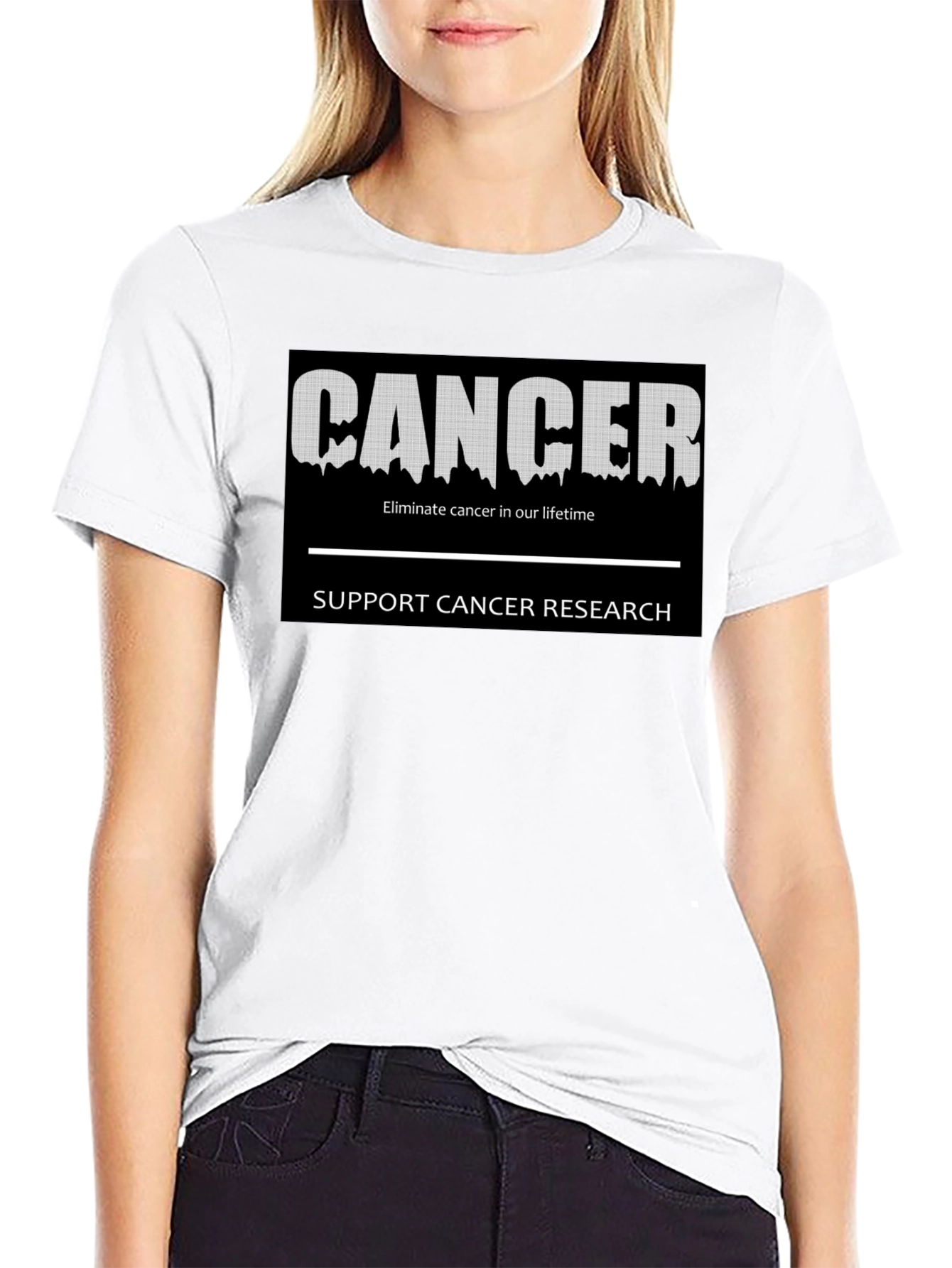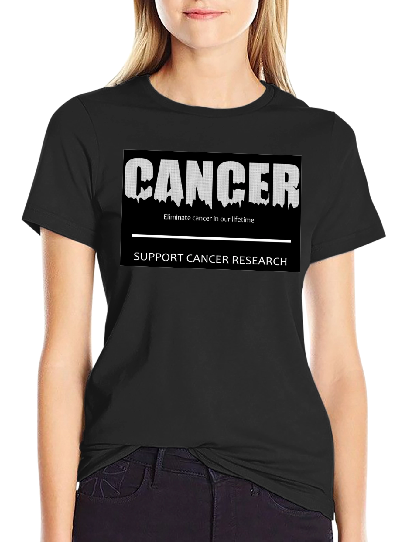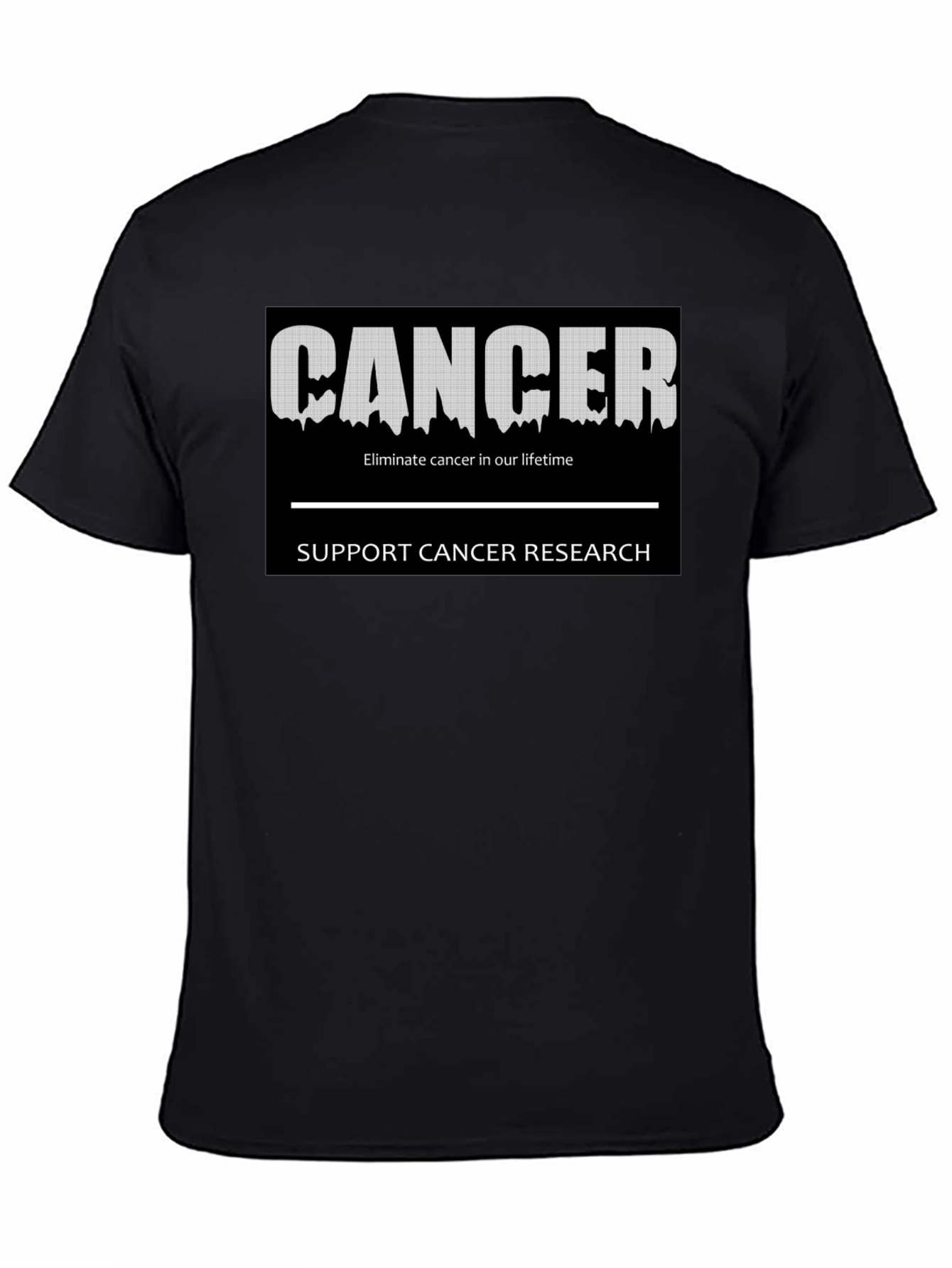 Show your support with this bold black t-shirt. The design features the word "CANCER" in a distressed, dripping font, set against a solid black background. Below, the call to action "Eliminate cancer in our lifetime" and "SUPPORT CANCER RESEARCH" are prominently displayed. This shirt is a powerful statement of solidarity, perfect for awareness walks, fundraisers, or everyday wear to spark important conversations. Comfortable and impactful, it's a meaningful addition to any wardrobe.