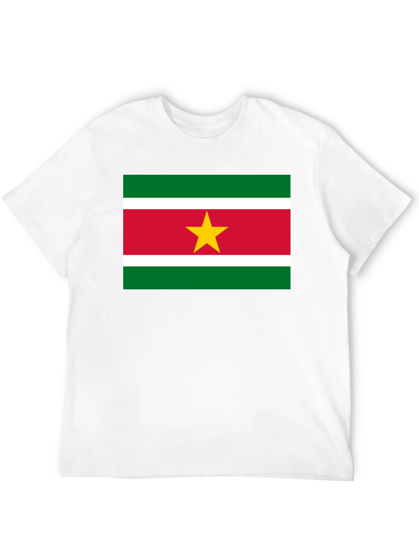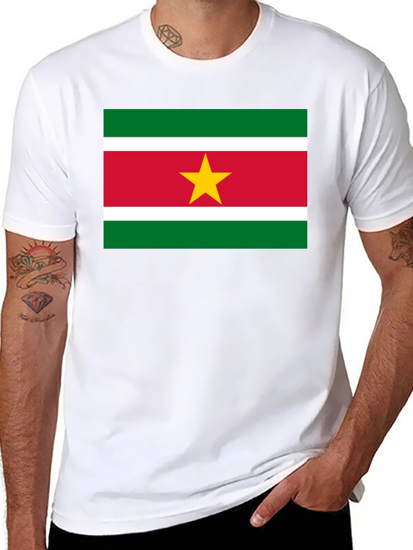 Show your Surinamese pride with this stylish black t-shirt featuring a vibrant Suriname flag design. The flag, prominently displayed on the chest, boasts the iconic green, red, and white stripes, along with a striking gold star. Made from comfortable and breathable cotton, this tee is perfect for everyday wear, sporting events, or cultural celebrations. Its classic fit makes it a versatile addition to any wardrobe. Wear your heritage with pride and make a statement with this unique Suriname flag t-shirt. A perfect gift for anyone with Surinamese roots or appreciation for the country's culture.