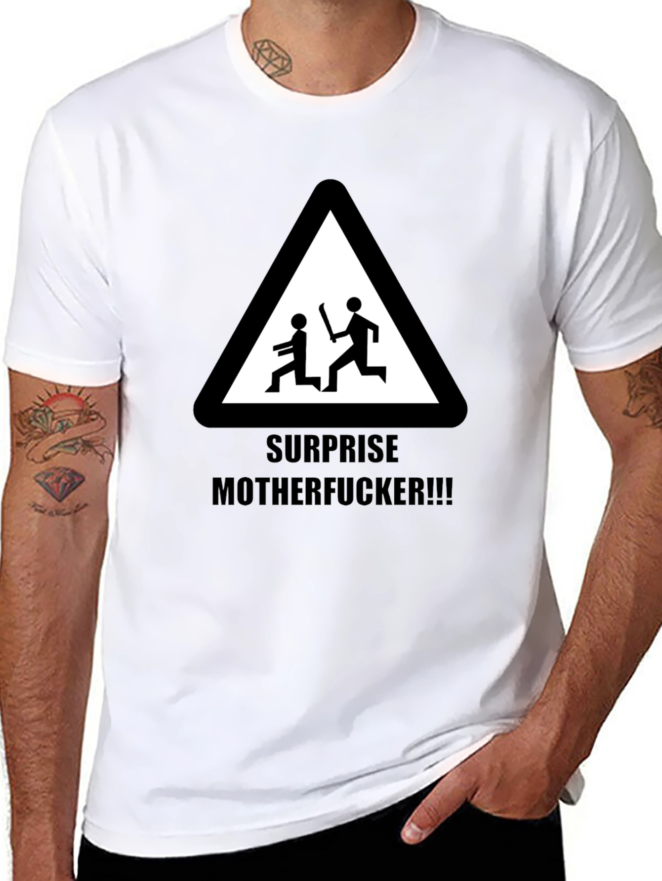 Make a bold statement with this eye-catching black t-shirt. The shirt features a provocative graphic design: a white triangular sign depicting one figure chasing another with a weapon, overlaid with the text "SURPRISE MOTHERFUCKER!!!". Crafted from a soft-looking cotton blend, this short-sleeve tee offers both comfort and a rebellious edge. Perfect for casual outings, parties, or as a conversation starter. Stand out from the crowd and express your unique sense of humor with this unforgettable tee.