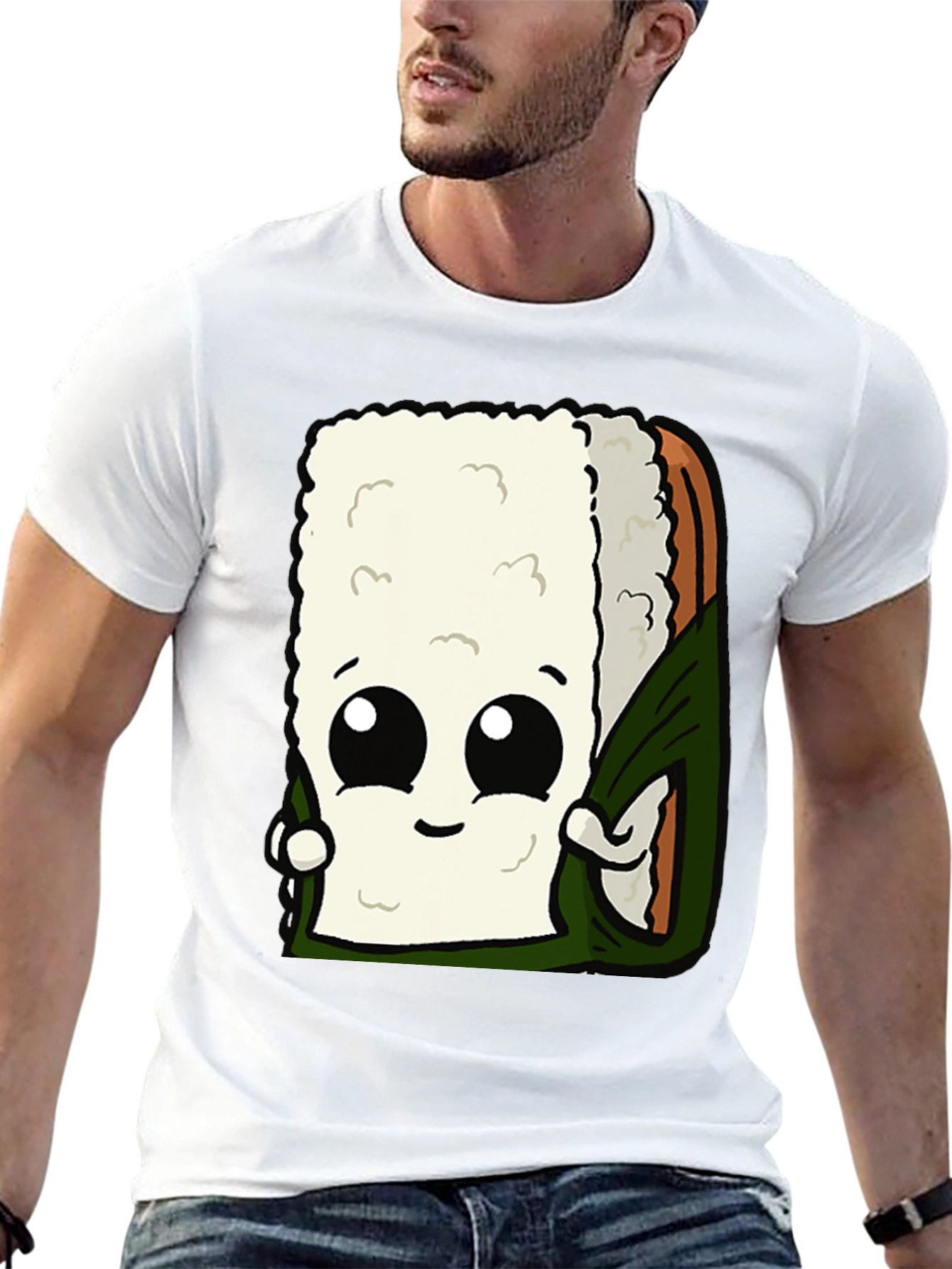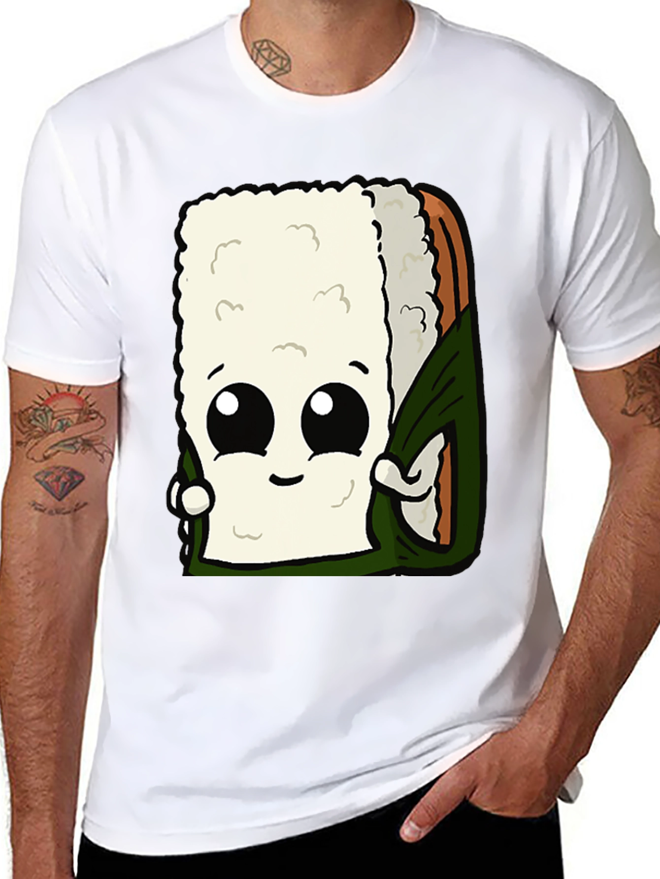 Add some fun to your wardrobe with this unique graphic tee! This black t-shirt features a playful cartoon-style sushi roll character. The sushi roll is designed with a cute, smiling face and a seaweed wrap. The design is printed on a soft fabric, offering both comfort and style. It's perfect for casual outings, food lovers, or anyone looking to add a quirky touch to their outfit. This tee is sure to be a conversation starter. Grab yours today!
