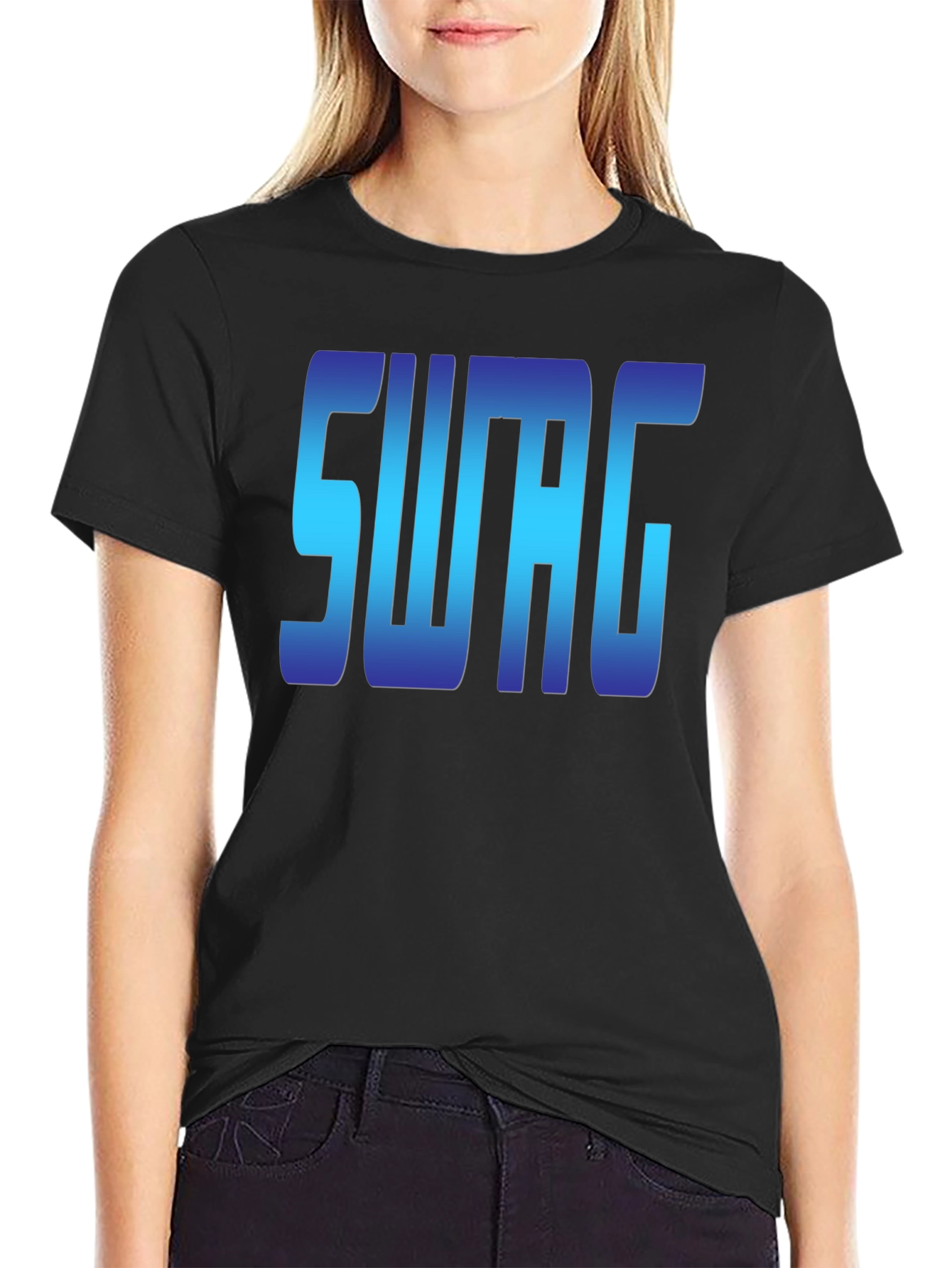 Show off your style with this black t-shirt featuring the word "SWAG" in a bold, gradient blue design. This eye-catching tee is made from a comfortable fabric, perfect for casual wear. The short-sleeved design and classic fit make it a versatile addition to any wardrobe. Wear it to hang out with friends, run errands, or just relax at home. This tee is sure to turn heads and make a statement wherever you go. Upgrade your wardrobe with this unique and trendy piece!