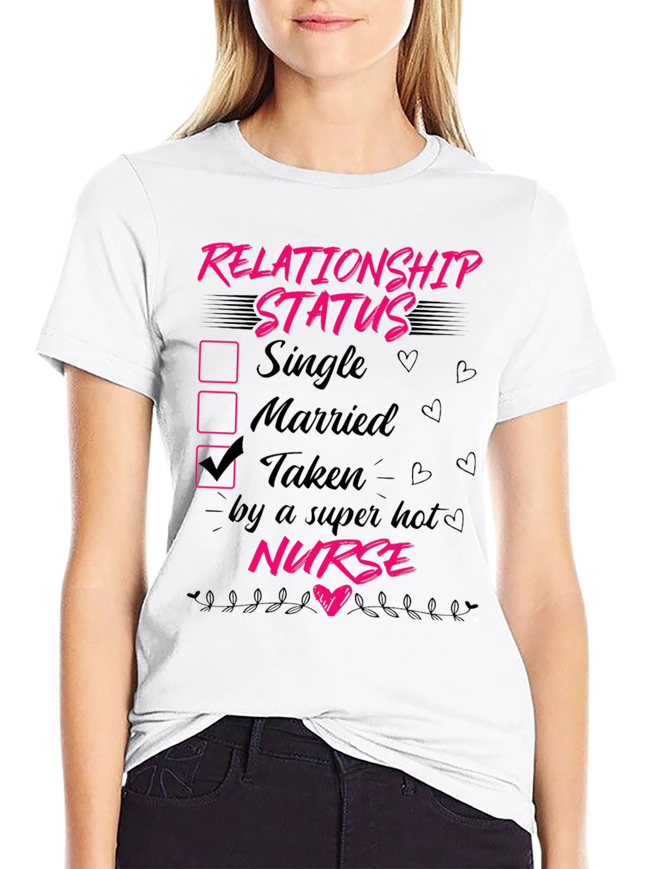 Show off your love with this fun novelty t-shirt. This black tee features a playful "Relationship Status" graphic with "Taken by a super hot NURSE" highlighted in pink. The design includes checkbox details and decorative heart accents, adding a touch of humor and charm. Perfect for casual wear, this shirt is a great conversation starter. Wear it to work, parties, or just lounging around to showcase your affection in a unique way. Makes a great gift for anyone taken by a nurse. Express yourself and make a statement with this fun and eye-catching design.