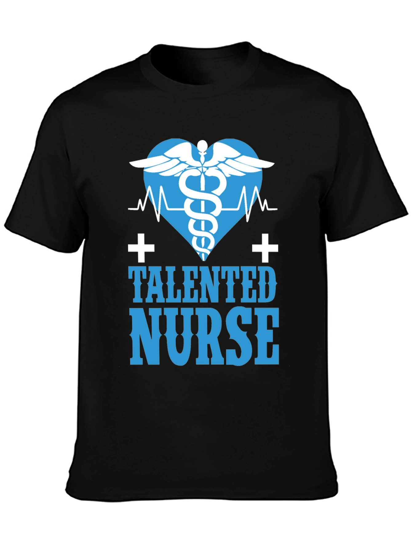 Show your appreciation for nurses with this stylish graphic tee! The black t-shirt features a striking light blue graphic design incorporating a heart, the Caduceus symbol, and an EKG waveform. The words 'TALENTED NURSE' are boldly displayed. Made from comfortable-looking fabric, this tee is perfect for everyday wear, hospital shifts, or showing support for healthcare professionals. A great gift idea for the dedicated nurse in your life. Wear it with pride and comfort!