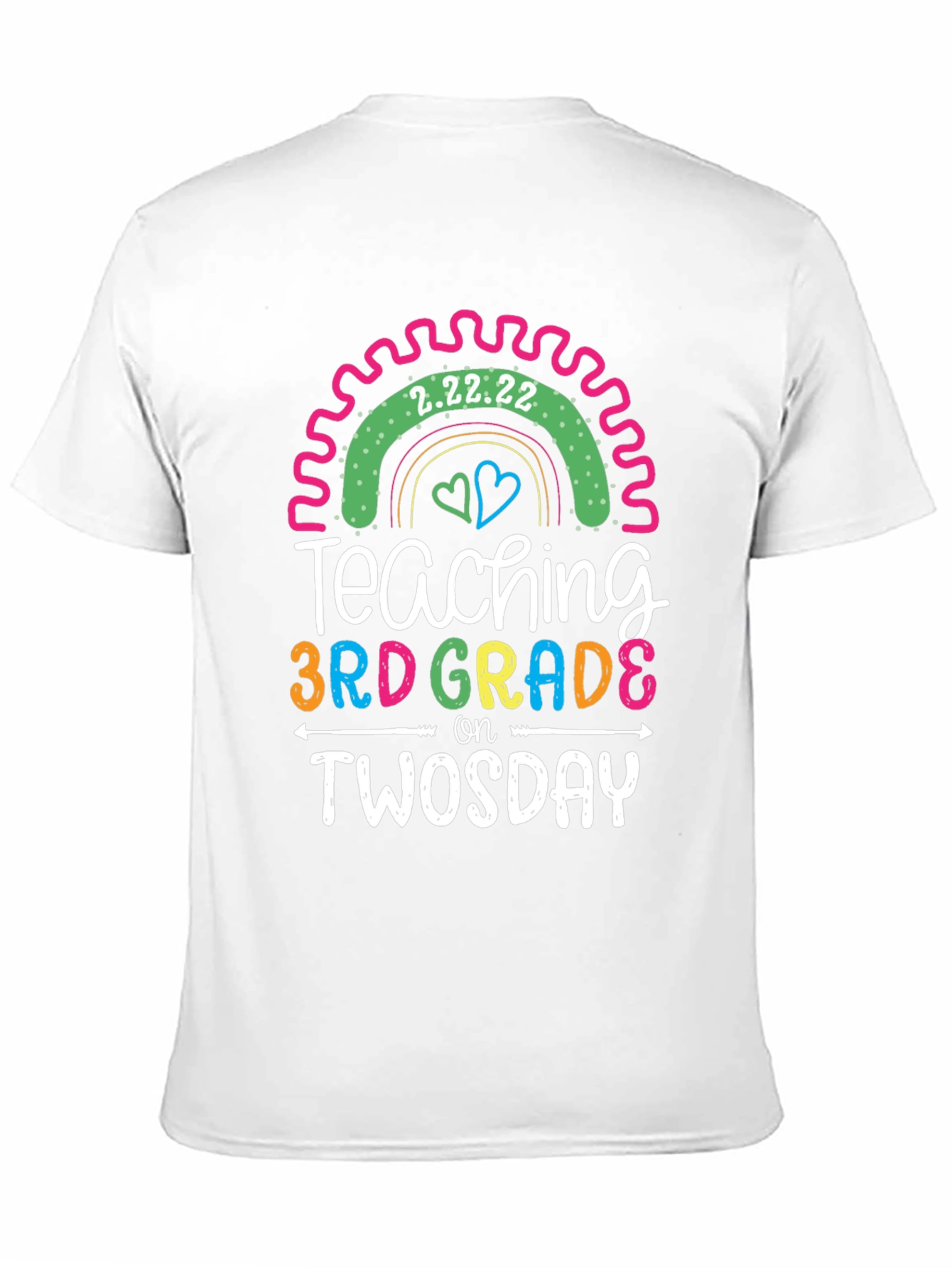 Celebrate 'Twosday' with this unique t-shirt! Featuring a colorful design with the text 'Teaching 3rd Grade on Twosday' beneath a playful rainbow graphic and '2.22.22'. The shirt is made from a soft, comfortable fabric, perfect for a long day of teaching. It's a fun way to commemorate this special date (2/22/22) in style. Wear it to school or any casual event to showcase your love for teaching and your enthusiasm for unique dates. A memorable keepsake for any 3rd-grade teacher!