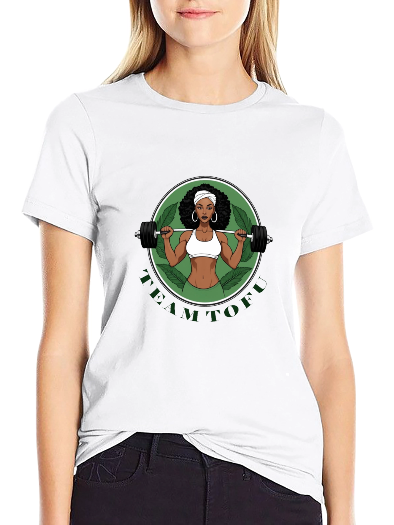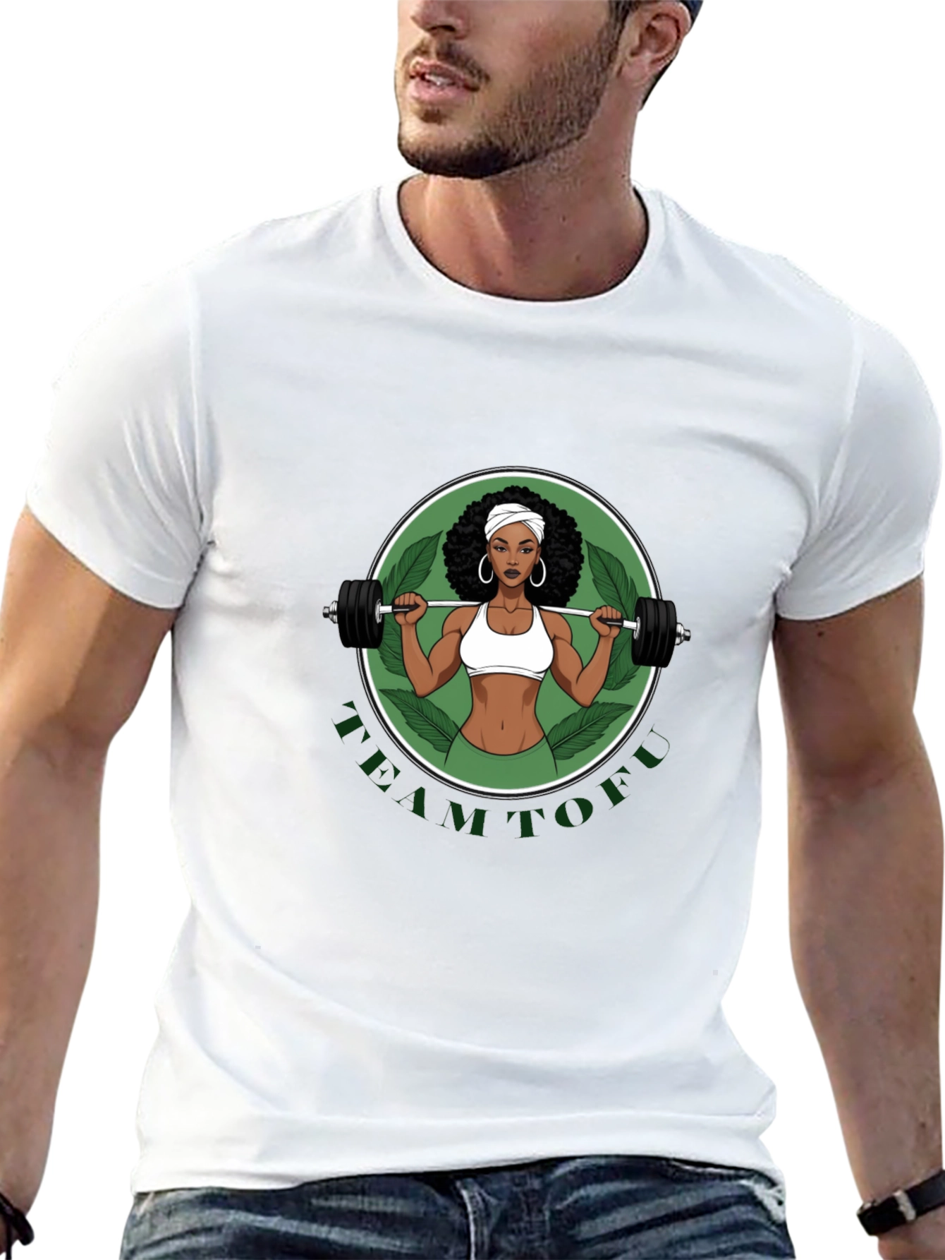 Show your love for tofu and fitness with this stylish black graphic tee! The shirt features a unique design with a woman lifting a barbell surrounded by green leaves and the words 'Team Tofu'. Made from comfortable and breathable fabric, this tee is perfect for workouts, casual outings, or simply lounging at home. It's a great conversation starter for vegans, vegetarians, and anyone who enjoys a healthy lifestyle. Get yours today and let the world know you're proud to be part of Team Tofu!