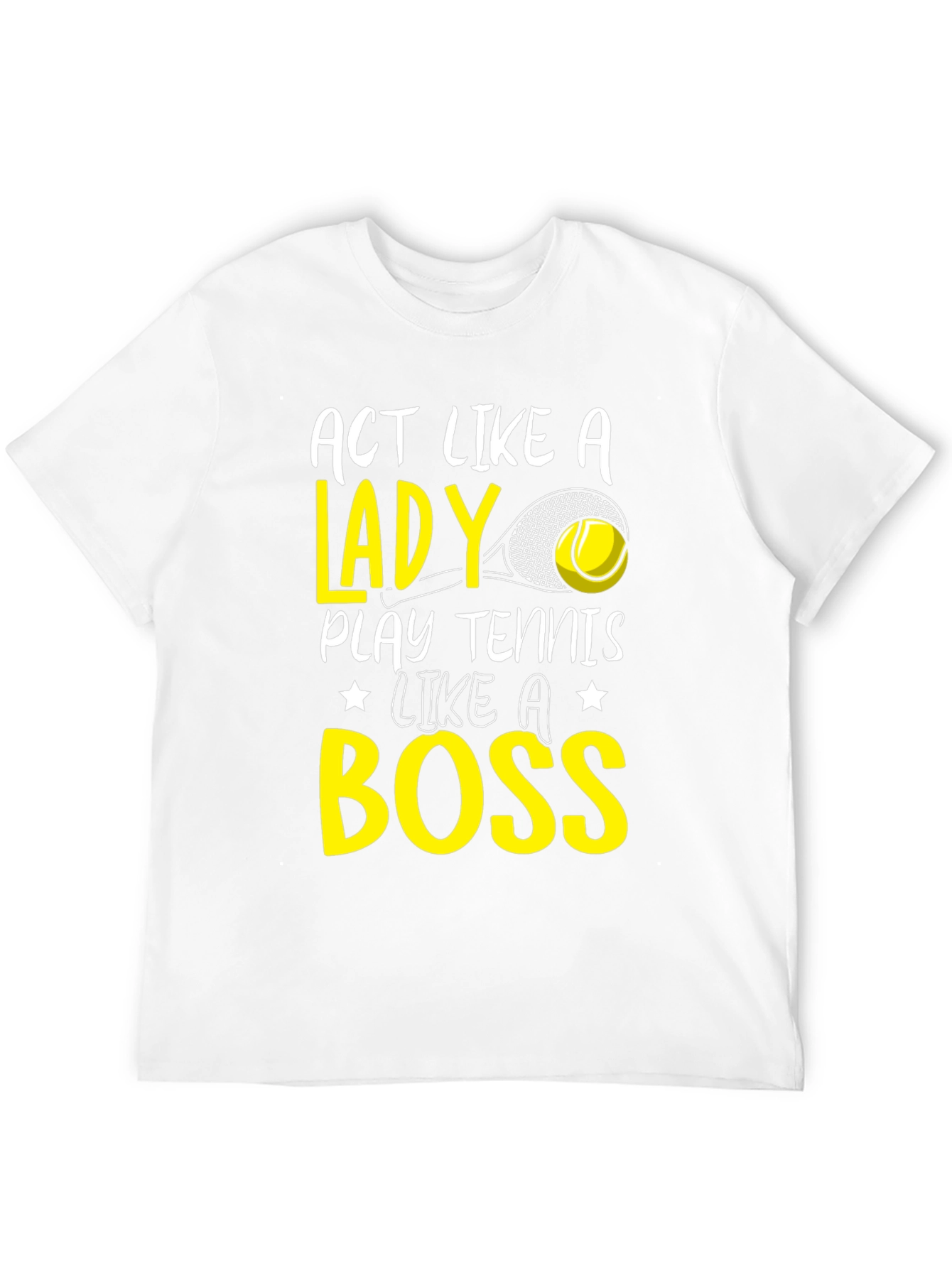 Show off your tennis prowess with this bold graphic t-shirt. The black shirt features a striking yellow and white design that reads "Act Like A Lady Play Tennis Like A Boss," incorporating a tennis ball and racket image. Made from comfortable fabric, this tee is perfect for casual wear or making a statement on the court. It's a fun and empowering piece for any female tennis enthusiast. Wear it to your next match, practice session, or simply as a stylish everyday top.