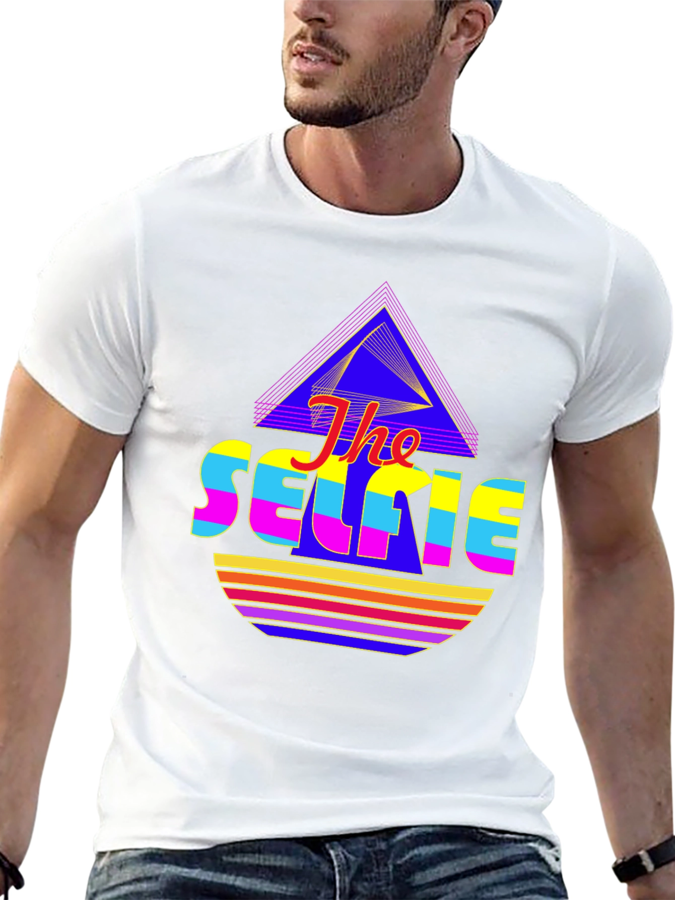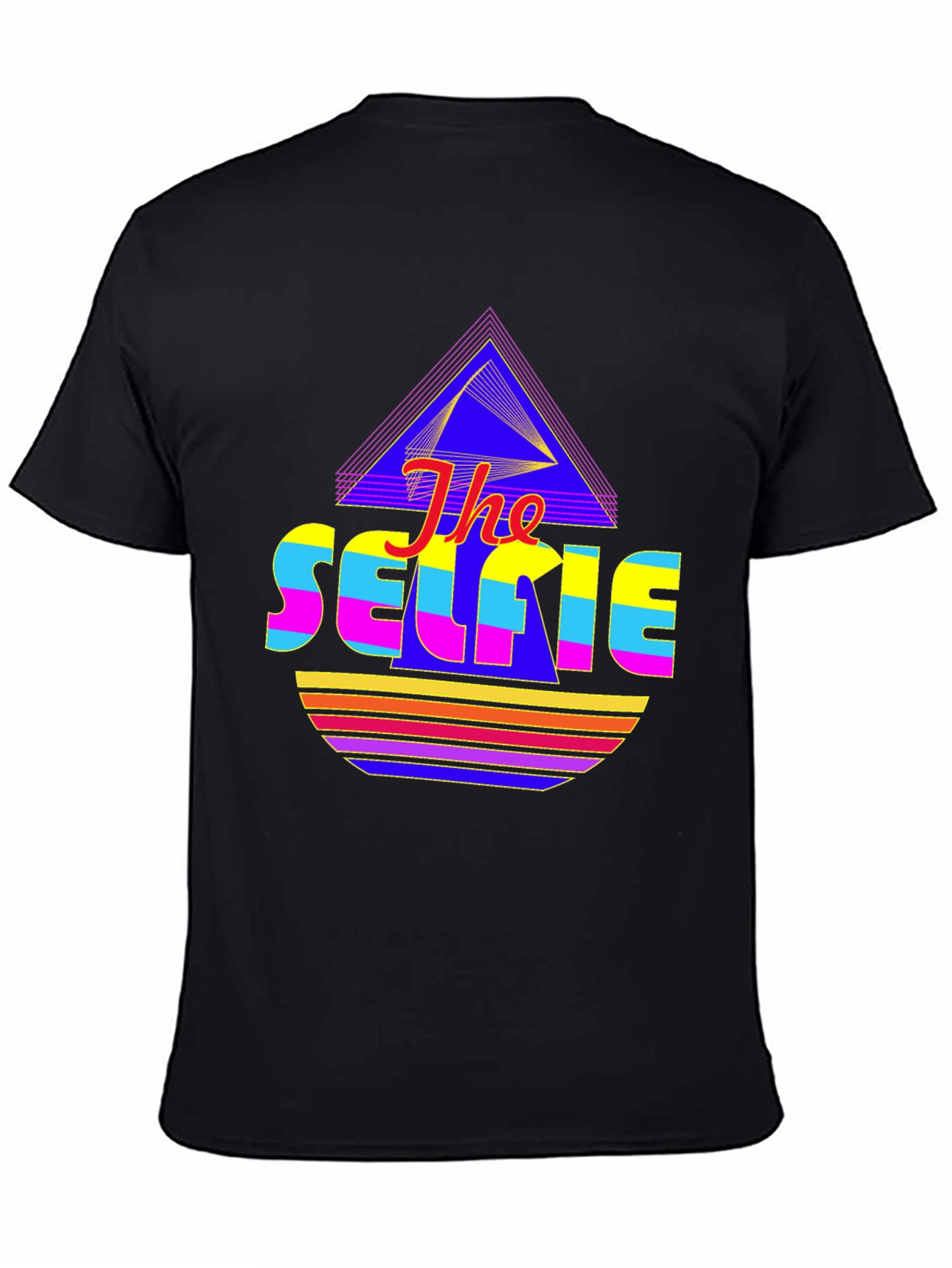 Step back in time with this vibrant "The Selfie" retro t-shirt. This black tee features a bold, 80s-inspired graphic with bright neon colors. The design incorporates a pyramid shape at the top and semi-circle lined graphic beneath the colorful "The Selfie" text. Made from a comfortable, breathable fabric, this t-shirt is perfect for casual wear, themed parties, or making a statement. Pair it with jeans, shorts, or leggings for a fun, throwback look. Stand out from the crowd and show off your unique style with this eye-catching retro tee!