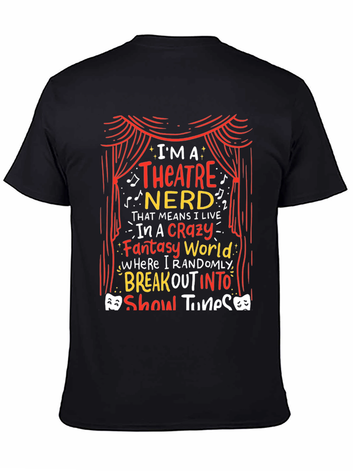 Showcase your passion for theatre with this unique graphic tee! Featuring a vibrant design with a stage curtain backdrop, this t-shirt proudly declares "I'M A THEATRE NERD" in bold, eye-catching lettering. The fun slogan continues, describing a life "IN A CRAZY FANTASY WORLD" where you "RANDOMLY BREAKOUT INTO Showl Tunes." Made from comfortable, breathable fabric, this black t-shirt is perfect for everyday wear, theatre rehearsals, or showcasing your love for the stage at conventions. The playful design and relatable message make it a great conversation starter and a fantastic gift for any theatre enthusiast. Let your inner theatre geek shine with this fun and expressive t-shirt!