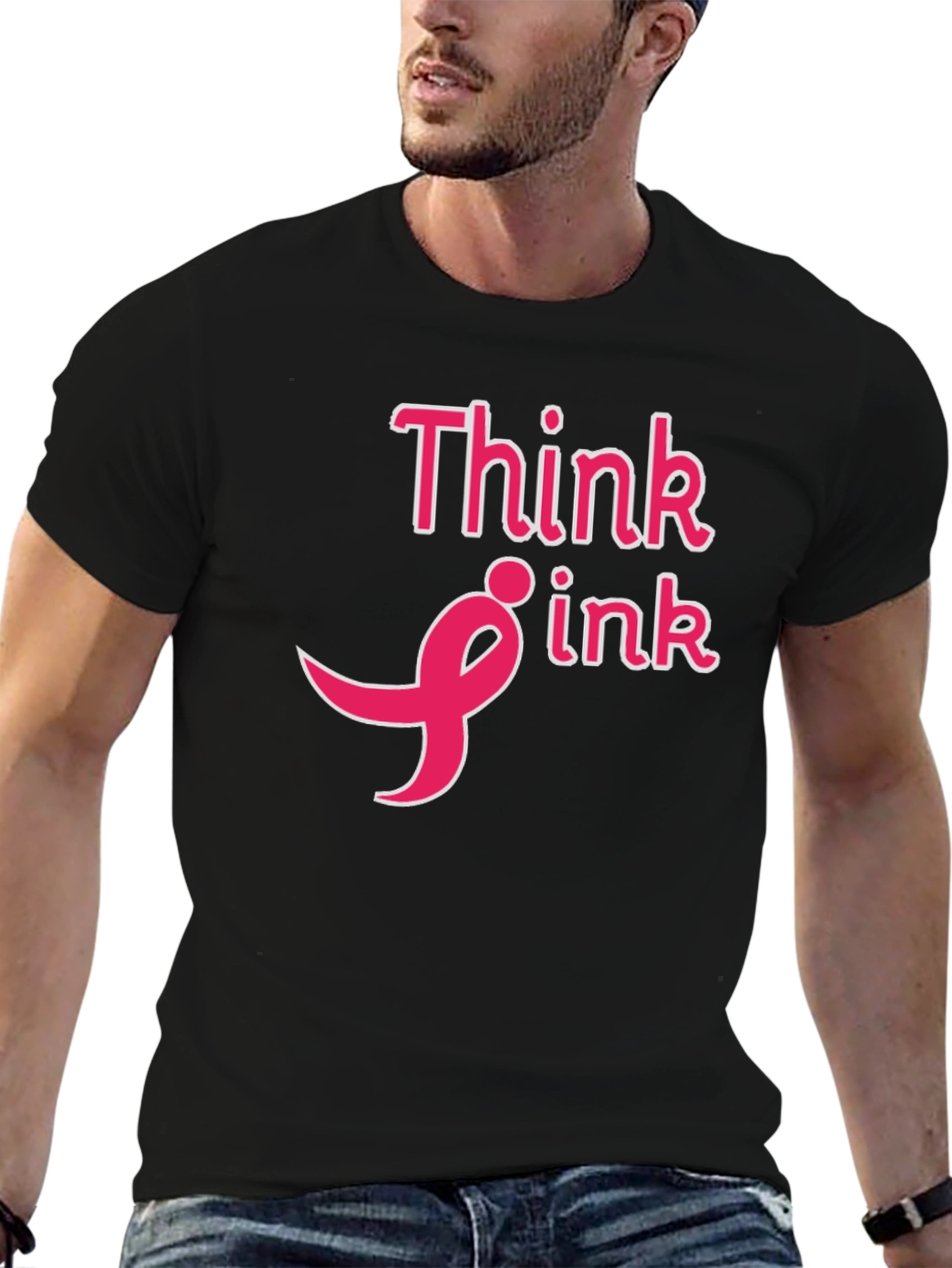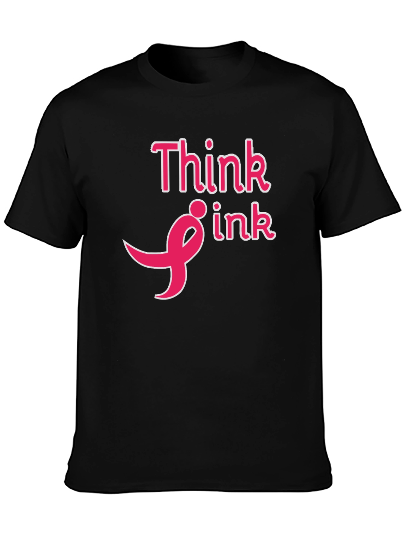 Show your support with this black t-shirt featuring a vibrant pink graphic design. The design includes the words "Think Pink" alongside a symbolic pink ribbon, raising awareness for breast cancer. Made from a comfortable material, this short-sleeved tee is perfect for everyday wear, walks, runs, or participating in charitable events. Let your fashion make a statement and contribute to a great cause. Wear it with pride and spread the message of hope and support for those affected by breast cancer.