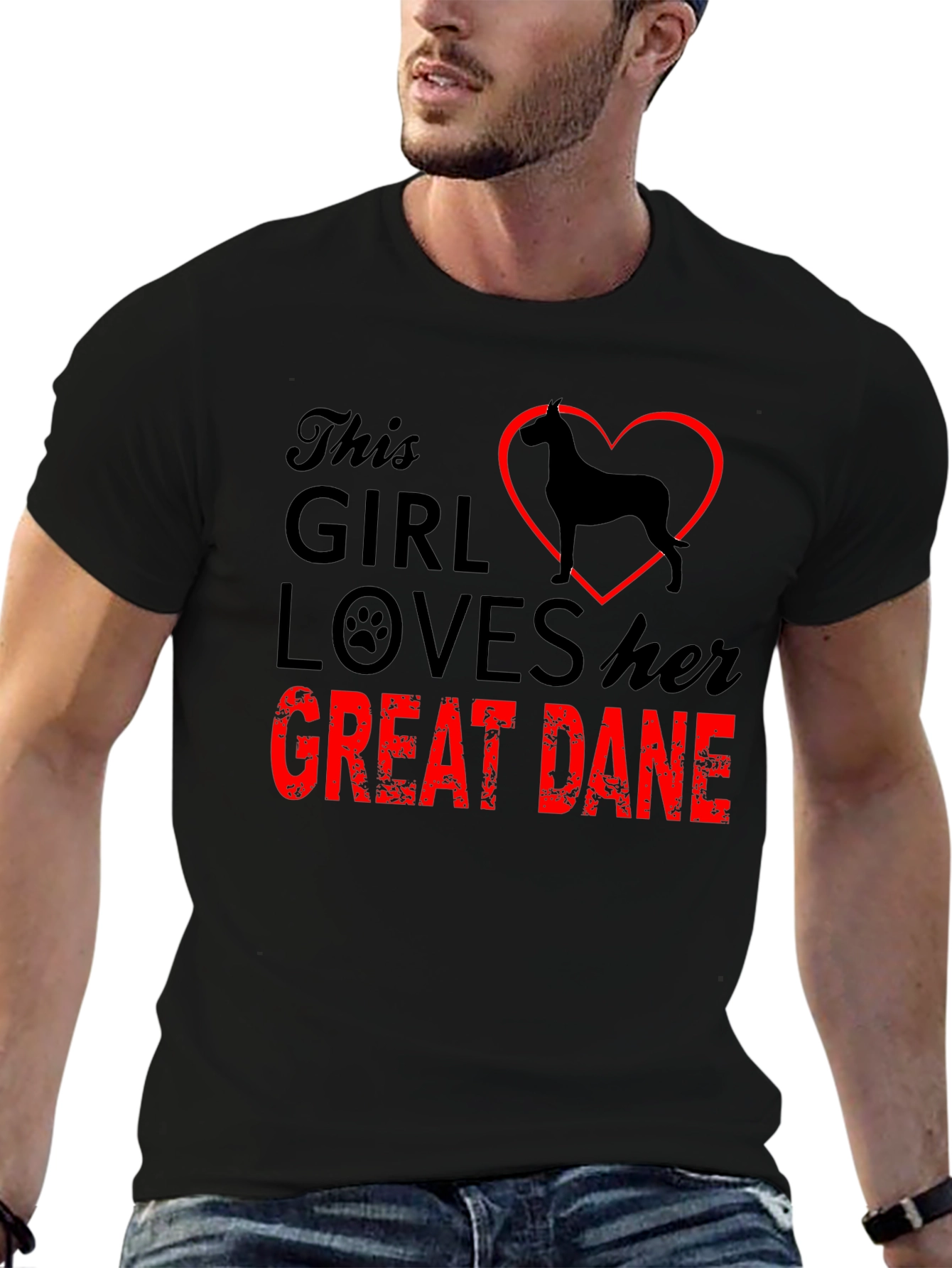 Show your love for Great Danes with this unique t-shirt! The black tee features a bold graphic design incorporating a silhouette of a Great Dane inside a red heart. The playful text "This GIRL Loves her GREAT DANE" makes it a perfect gift for any Great Dane owner. Made from a comfortable fabric, this shirt is ideal for casual wear, dog walks, or dog shows. Get yours now and let everyone know about your love for your Great Dane!
