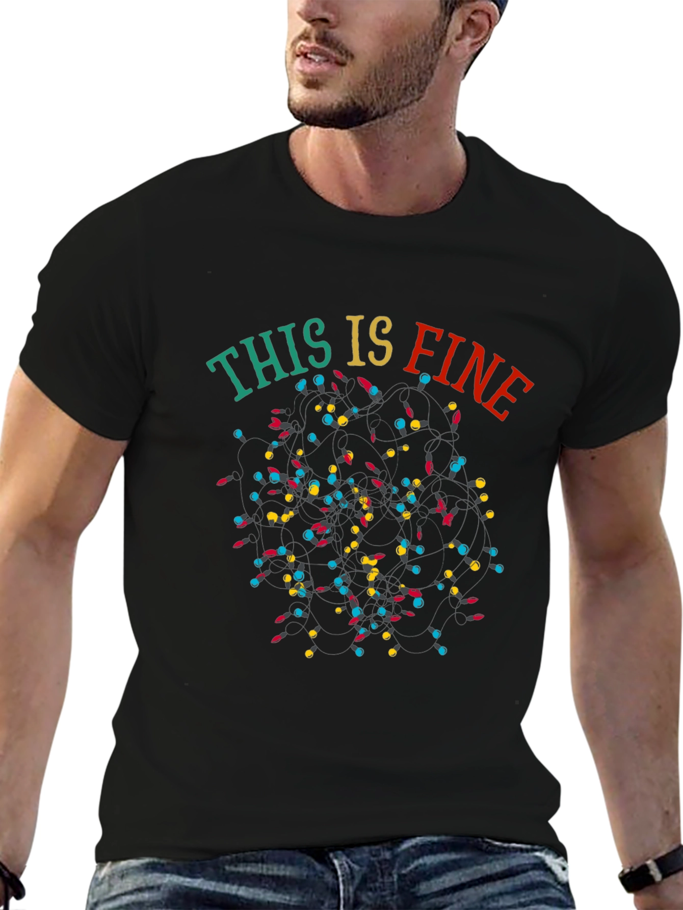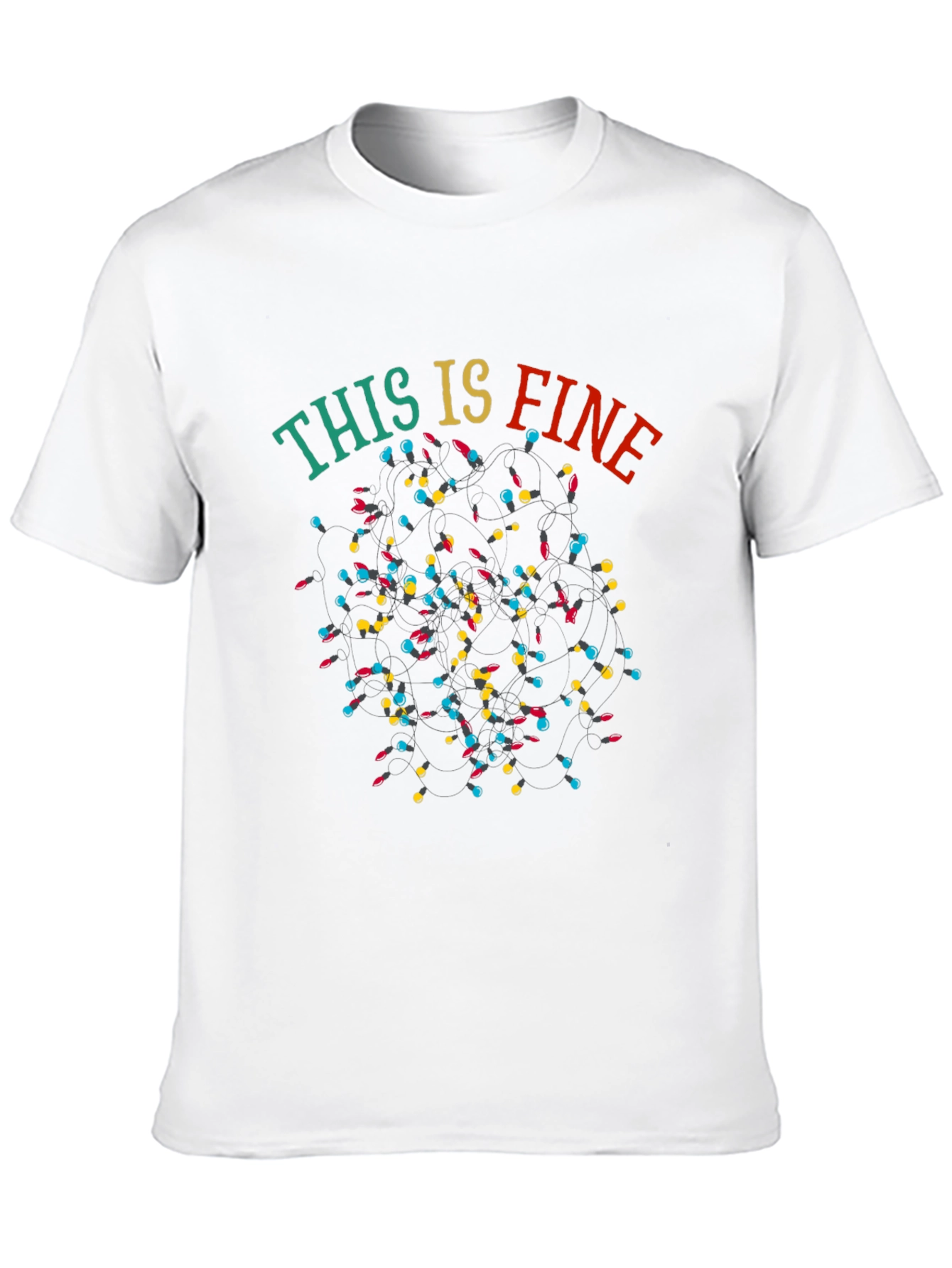 Embrace the chaotic joy of the holidays with this "This Is Fine" themed T-shirt. The shirt features a string of tangled Christmas lights in blue, yellow, and red, playfully arranged with the phrase "This Is Fine" in festive lettering above them. It's a perfect blend of humor and holiday spirit. Ideal for casual wear, holiday parties, or as a unique gift for friends and family who appreciate a touch of sarcasm. The short-sleeved shirt is shown in black, offering a comfortable fit and a fun, relatable message for the holiday season.