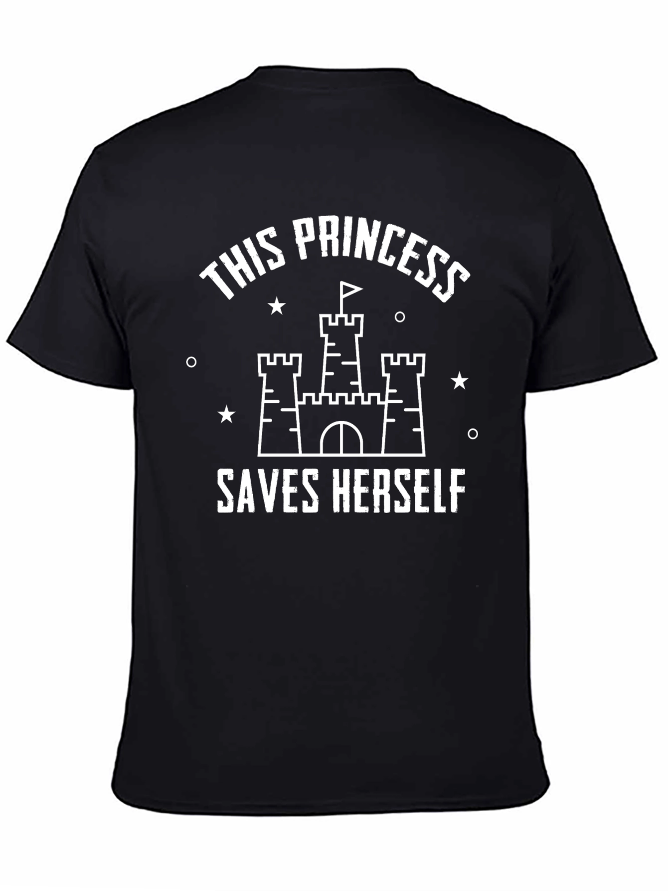 Empower your inner princess with this stylish black graphic t-shirt. Featuring a whimsical design with a castle illustration and the empowering statement "This Princess Saves Herself," this tee is perfect for anyone who believes in self-reliance and strength. Made from a comfortable, breathable fabric, it's ideal for everyday wear, casual outings, or making a statement. Show off your independent spirit with this unique and fashionable t-shirt. It is a perfect gift for the strong woman in your life.