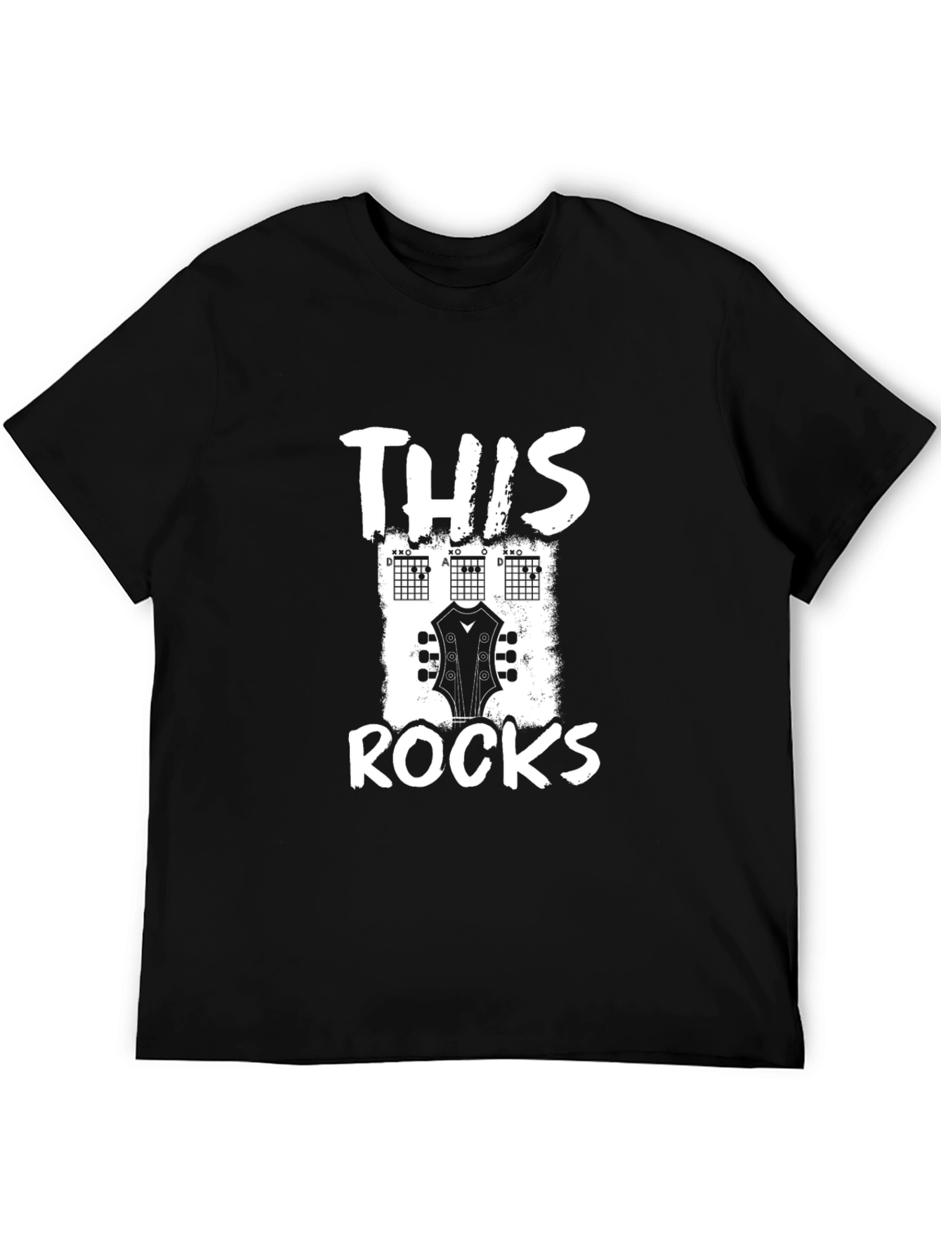 Show off your love for music with this unique "This Rocks" t-shirt! This classic black tee features a bold, white graphic design incorporating guitar chords and a silhouette of a guitar. The design is eye-catching and perfect for guitarists, music lovers, or anyone who wants to express their passion for rock music. Made from a comfortable-looking fabric, this shirt is ideal for casual wear, concerts, band practice, or simply lounging around. Let your love for music shine with this conversation-starting t-shirt!