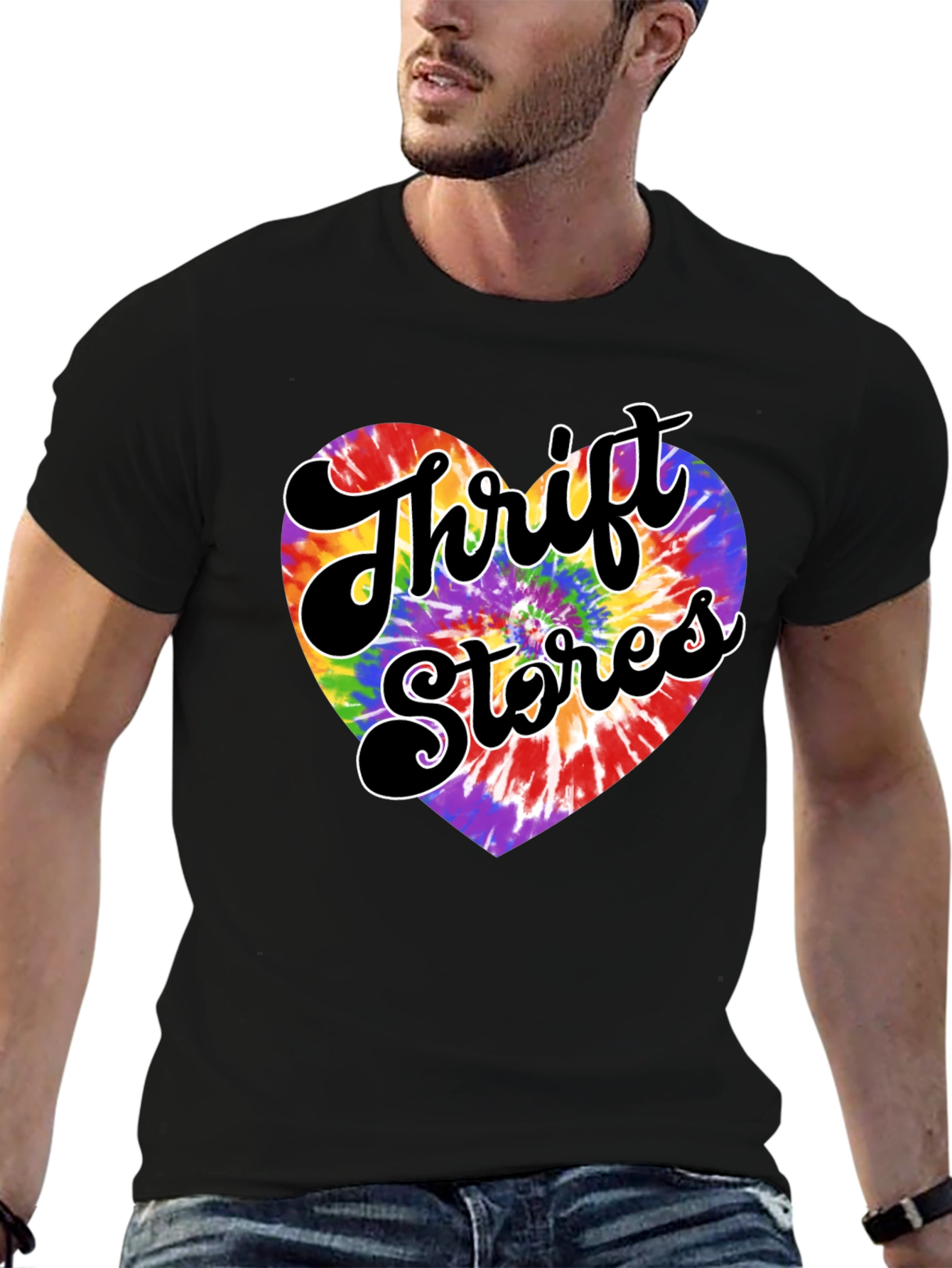 Show your love for thrifting with this stylish black t-shirt! The shirt features a vibrant tie-dye heart graphic with the words "Thrift Stores" in a groovy black script. Made from a soft, comfortable fabric, this tee is perfect for everyday wear. Express your unique style and passion for sustainable fashion. Ideal for casual outings, thrift store hauls, or adding a pop of color to your wardrobe. Let everyone know you are an advocate for thrifting with this graphic tee!
