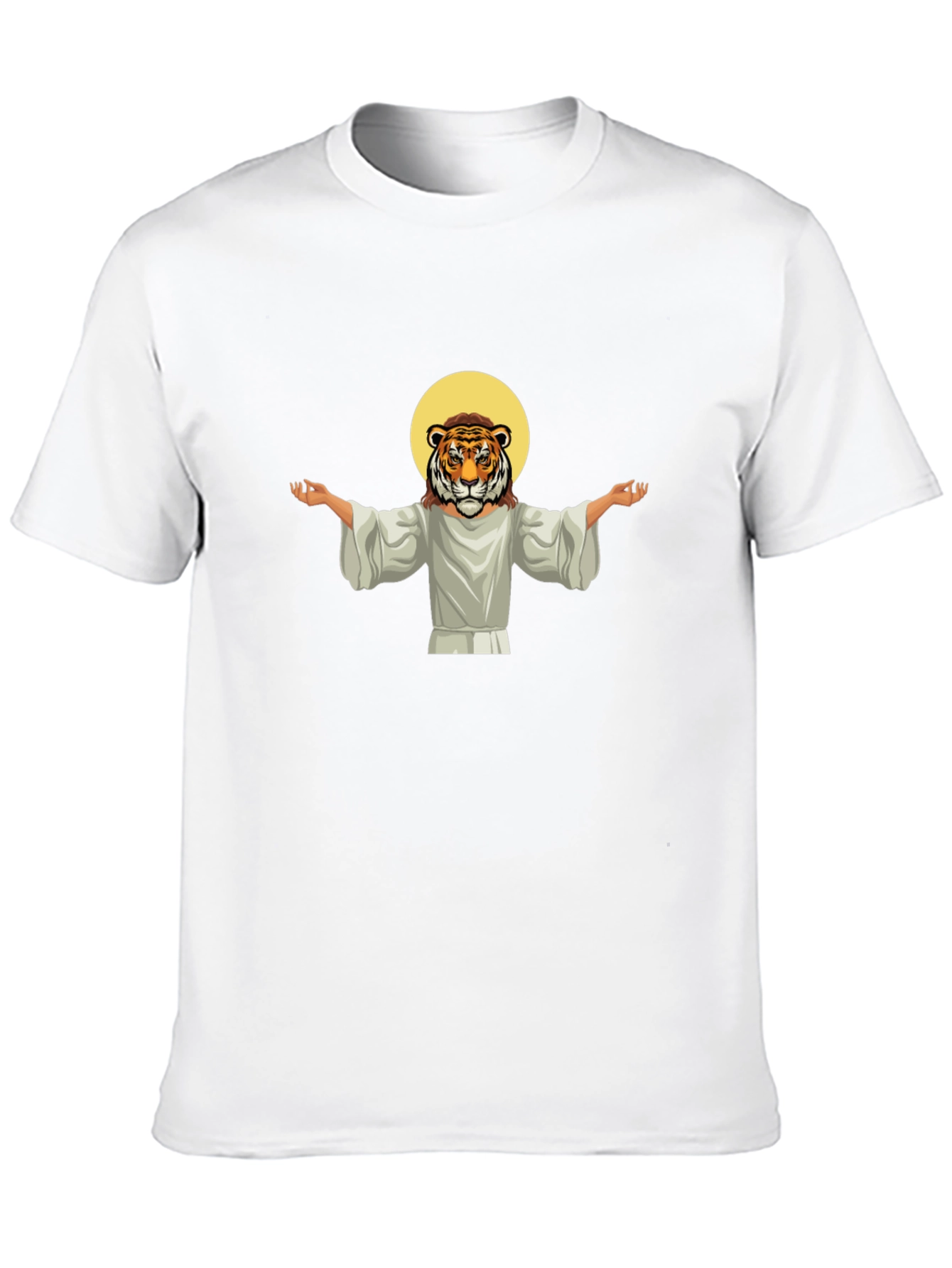 This unique black t-shirt features a bold and eye-catching graphic of a tiger with a halo, dressed in what appears to be a robe with open arms. The design is centered on the chest, making it a standout piece. This tee is perfect for those who appreciate quirky, artistic designs and want to make a statement. Ideal for casual wear, concerts, or as a conversation starter. Comfortable fit for everyday style.