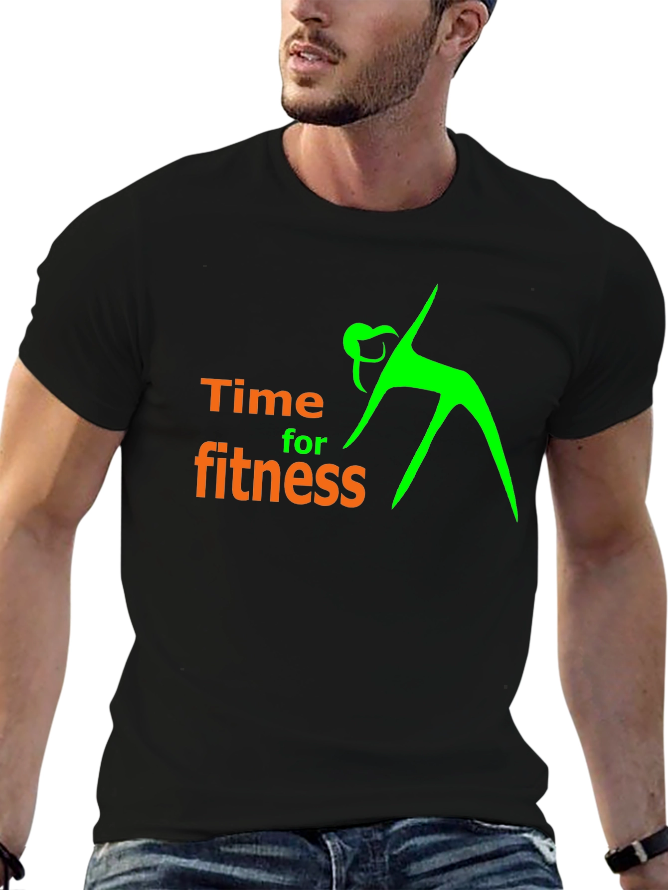 Elevate your workout style with this sleek black graphic tee. Featuring a vibrant neon green fitness figure and bold orange "Time for fitness" text, this shirt is designed to inspire your active lifestyle. Crafted from comfortable, breathable fabric, it offers a relaxed fit perfect for gym sessions, yoga, or casual wear. Show off your commitment to health and wellness with this eye-catching and motivational t-shirt. It's more than just apparel; it's a statement. Gear up and make every moment count on your fitness journey. Stand out with this unique design.