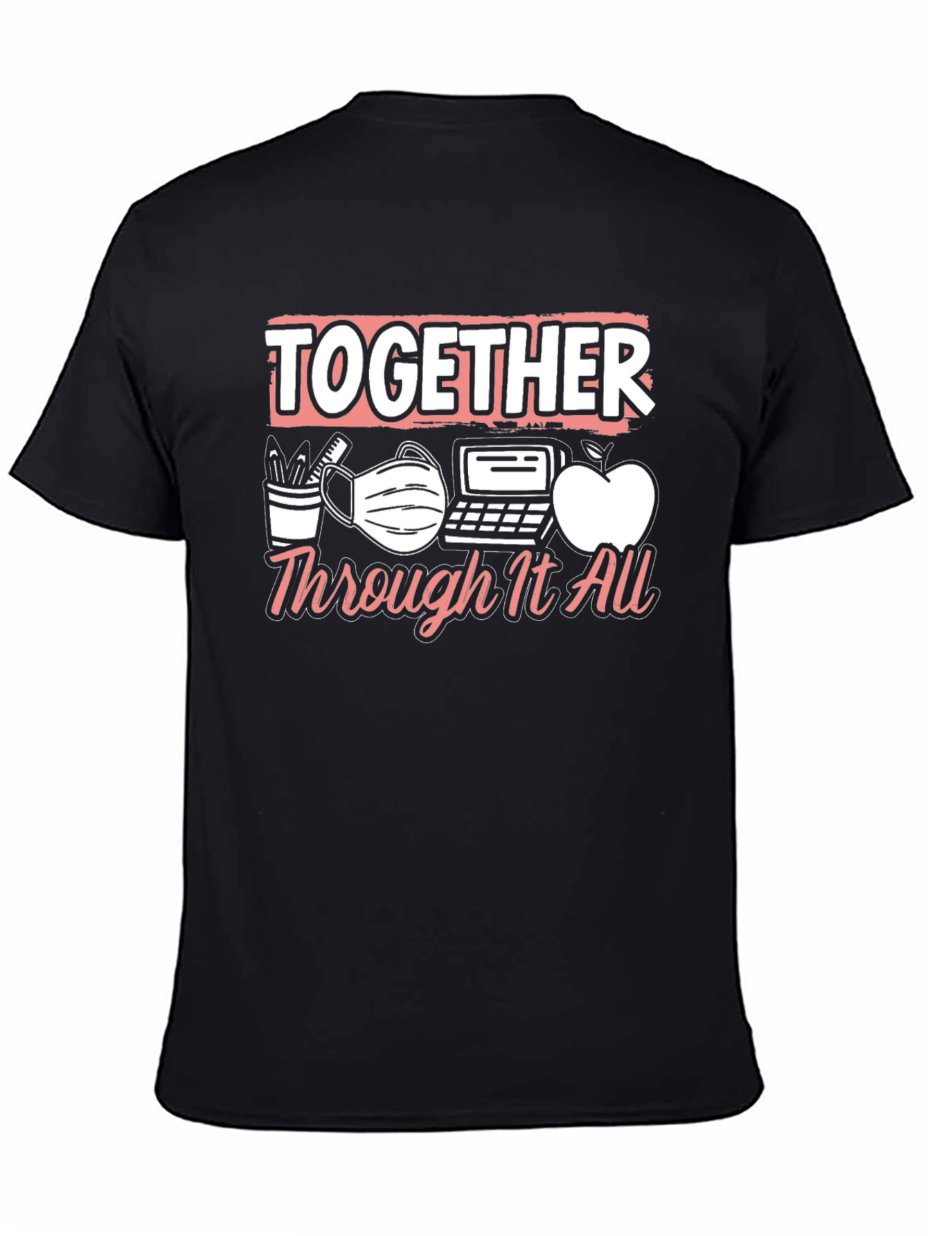 This black T-shirt features a graphic print design. The design has the word 'Together' above the words 'Through It All' in a stylized font. In between is the image of school-related objects such as a pencil cup with writing utensils, a face mask, a laptop, and an apple. The print has a subtle, artistic look. This comfortable tee is a great gift idea for the educators in your life who have been there through everything! The T-shirt is ideal for everyday wear, teacher appreciation week, or casual outings.