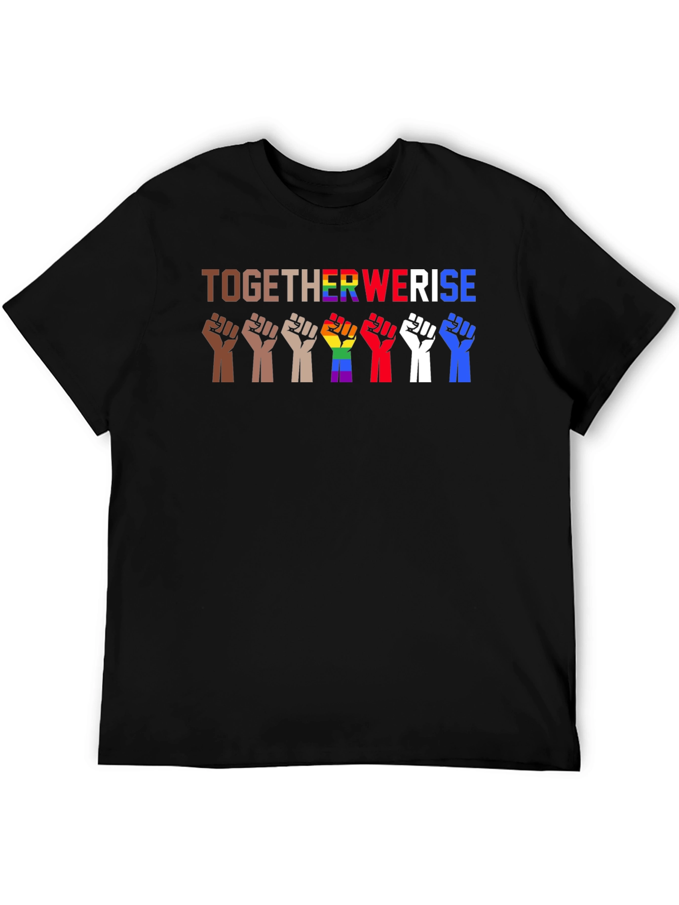 Show your support for unity and equality with this eye-catching "Together We Rise" T-shirt. Featuring a series of raised fists in a range of skin tones and vibrant rainbow colors, this shirt symbolizes solidarity and inclusivity. Made from comfortable, breathable fabric, this classic black tee is perfect for everyday wear, rallies, community events, or casual outings. Let your clothing make a statement and inspire positive change with this powerful and stylish T-shirt. Available in various sizes. Machine washable.