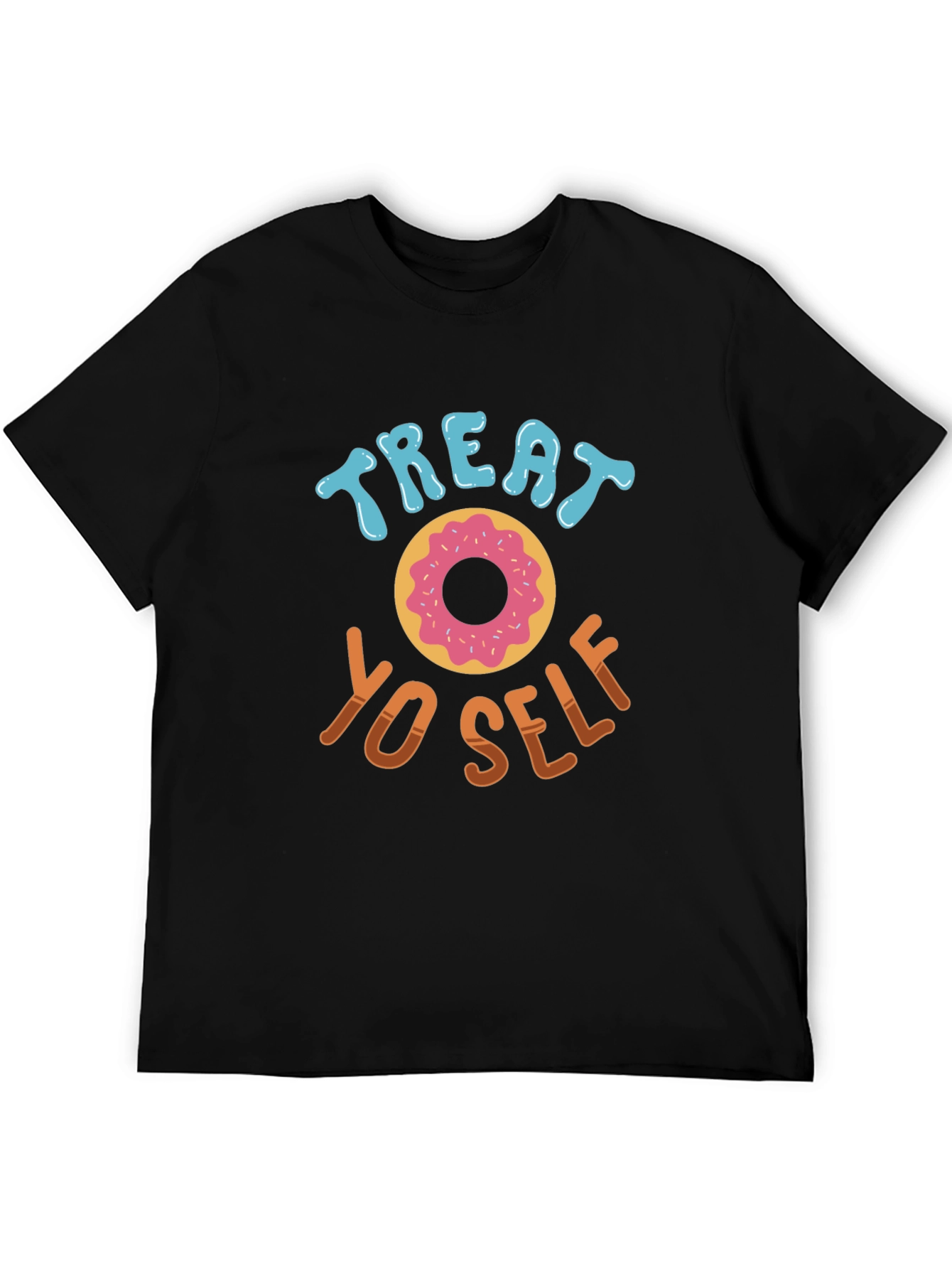 Indulge in delightful style with this black T-shirt featuring a fun 'Treat Yo Self' graphic. A vibrant doughnut icon adds a playful touch. Made from comfortable, breathable fabric, this tee offers a relaxed fit perfect for everyday wear. The eye-catching design is ideal for casual outings, social gatherings, or simply lounging at home. Pair it with jeans, shorts, or leggings for a versatile and trendy look. Show off your fun personality and enjoy the perfect blend of comfort and style with this unique T-shirt.