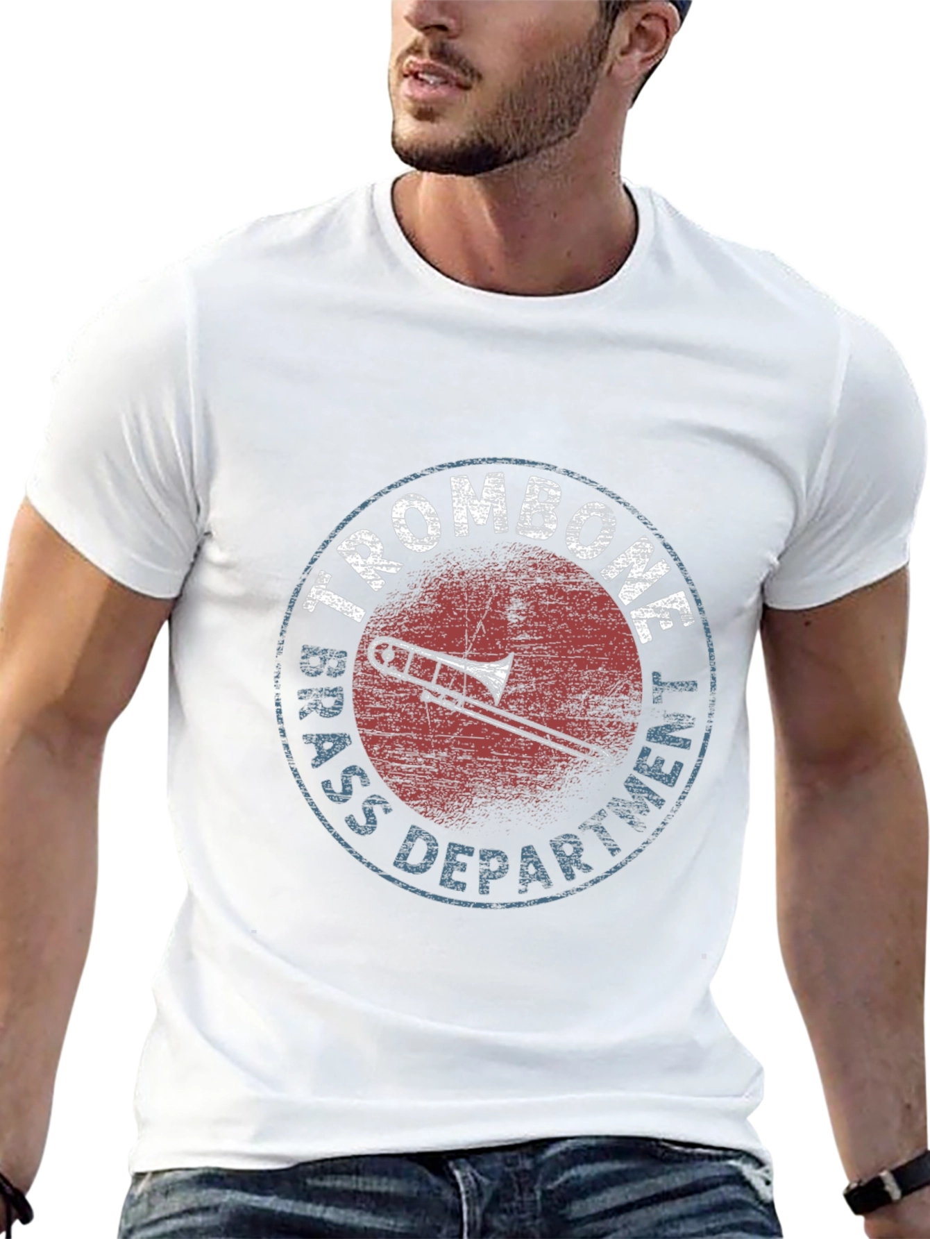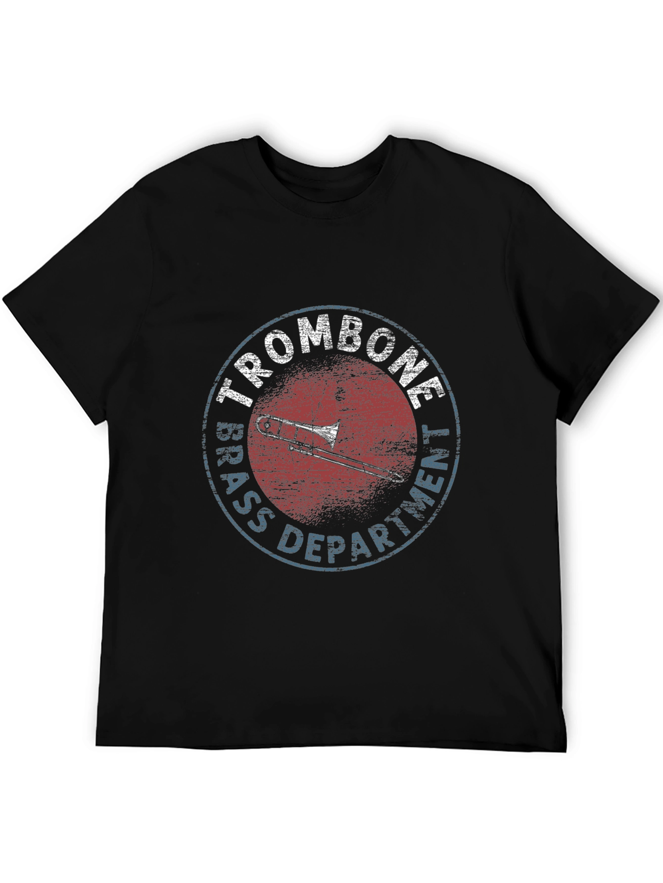 Show off your love for brass instruments with this unique graphic tee! This black t-shirt features a vintage-style design of a trombone set against a distressed red circle, encircled by the words "Trombone Brass Department" in a classic blue font. The soft fabric ensures comfort, making it perfect for casual wear or band practice. Ideal for musicians, music lovers, or anyone who appreciates a touch of retro style. Wear it to concerts, music festivals, or just around town to showcase your passion for music.
