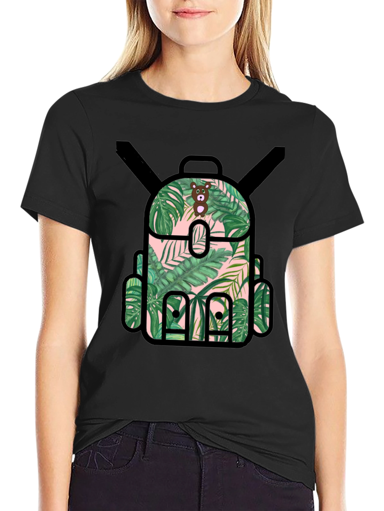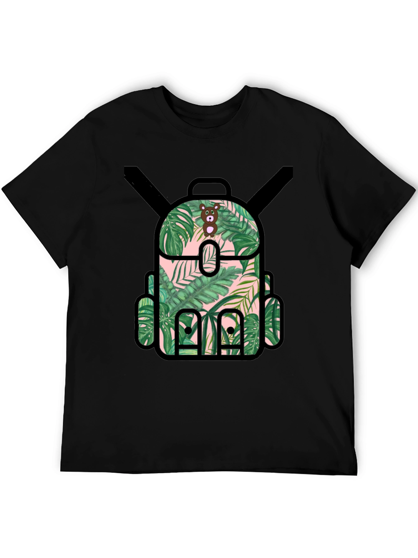 Show off your love for nature with this unique black t-shirt. The shirt features a vibrant graphic of a backpack, adorned with a lush tropical leaf pattern in shades of green and pink. A cute teddy bear detail adds a playful touch. Made from comfortable, breathable fabric, this tee is perfect for everyday wear. Its eye-catching design makes it a great conversation starter, ideal for casual outings, hiking trips, or simply relaxing at home. Stand out from the crowd with this stylish and comfortable tropical backpack graphic tee.