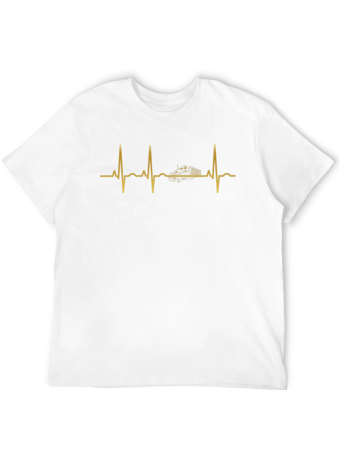 This unique black t-shirt features a striking gold-colored graphic of a heartbeat line, with a truck integrated in the middle, symbolizing a driver's passion. Made from what appears to be a soft and comfortable cotton blend, this tee offers both style and breathability. The design is a perfect way to show off your love for trucking or makes a great gift for any truck driver in your life. Wear it casually or on the road, this t-shirt is a statement piece that speaks to the heart of the open road. Get yours today and wear your passion!