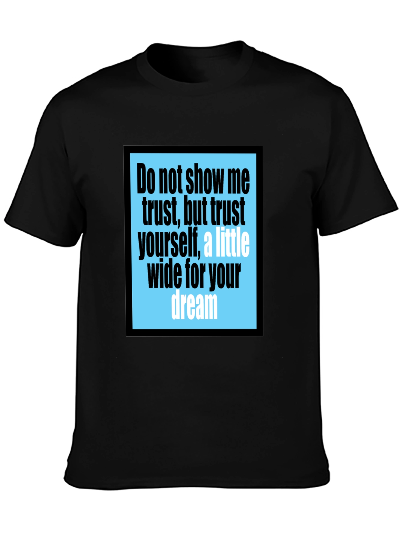 This black t-shirt features a motivational message. The graphic showcases the phrase "Do not show me trust, but trust yourself, a little wide for your dream" in white lettering against a light blue background with black borders. The tee appears to be made of a soft, comfortable fabric, perfect for casual everyday wear. The bold text is eye-catching and inspiring. Ideal for those who value self-reliance and pursuing their dreams. This shirt is a great way to express your inner strength and inspire others around you. Perfect for a relaxed, confident style.