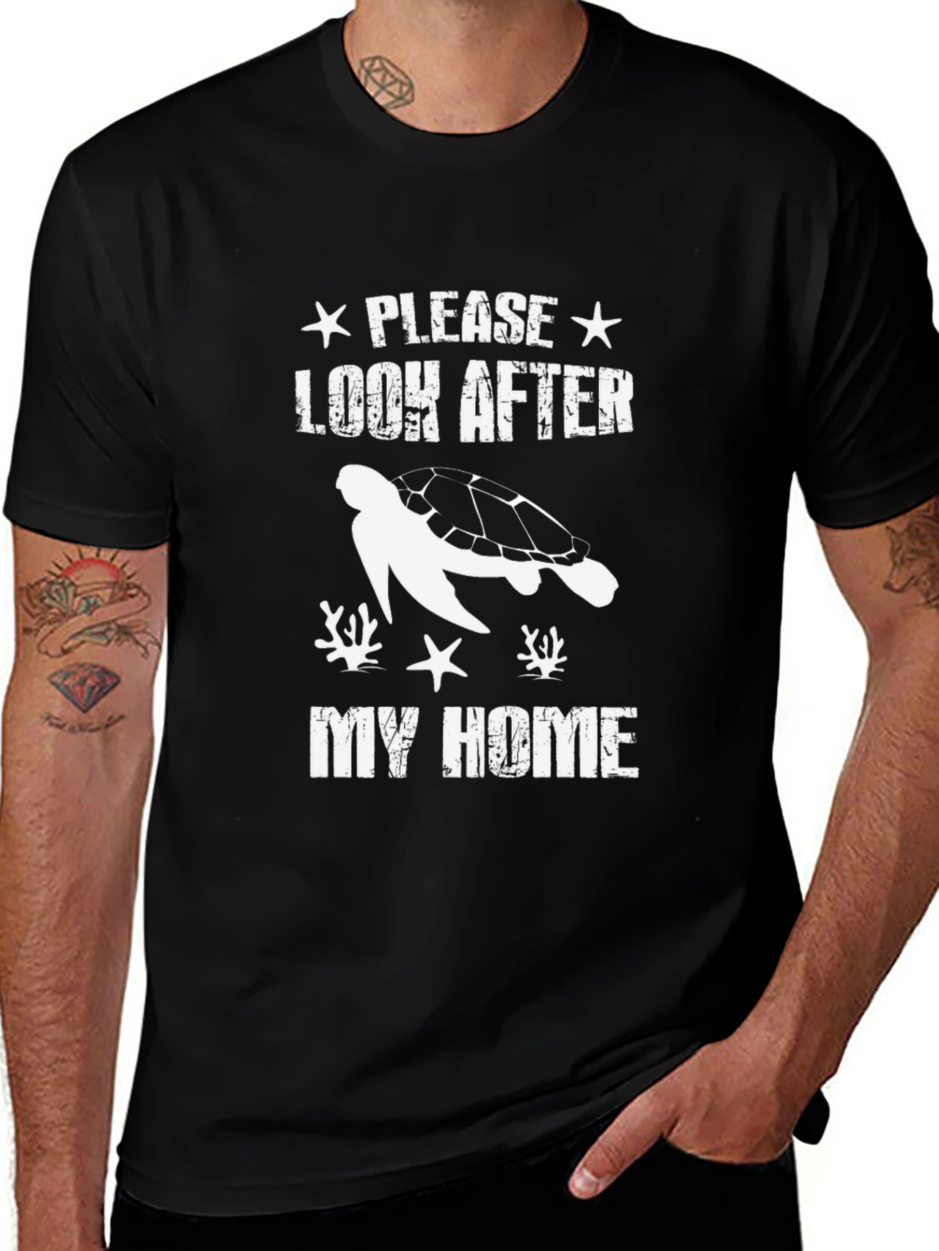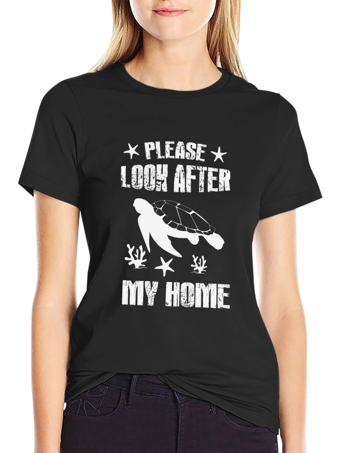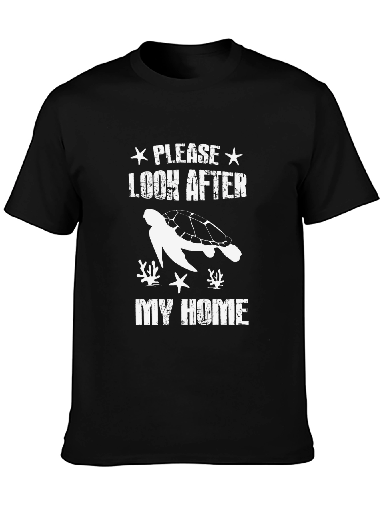 This stylish black t-shirt features a white graphic print with a turtle, starfish, and coral design. Above the turtle is "PLEASE LOOK AFTER" and below the turtle the text "MY HOME". The shirt has a classic crew neck and short sleeves, making it perfect for casual wear. The design promotes environmental awareness and conservation, great for ocean lovers. Made from a soft fabric blend, this t-shirt offers both comfort and durability. Ideal for everyday wear, beach outings, or as a thoughtful gift for nature enthusiasts. Grab this unique piece and show your care for the ocean's creatures!