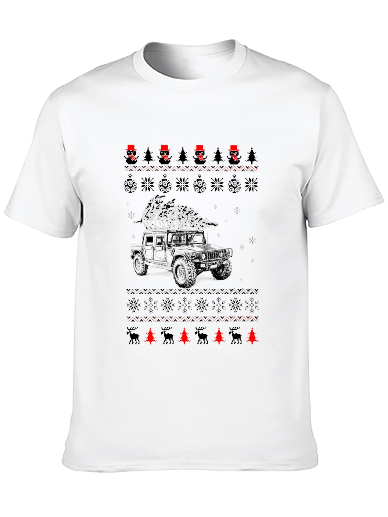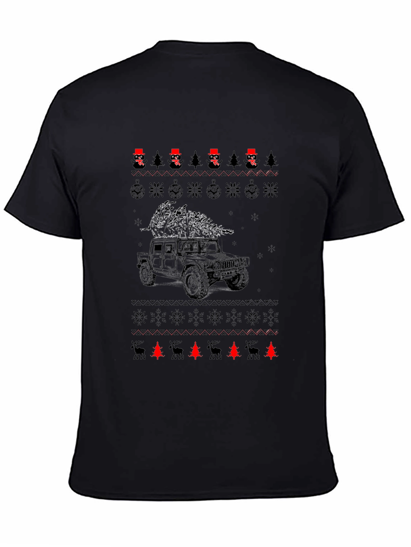 Get ready for the holidays with this fun and unique black t-shirt. It features a festive 'ugly sweater' style design with rows of snowflakes, Christmas trees, and snowmen wearing top hats. A Hummer carrying a Christmas tree on top is centered on the tee. This shirt is perfect for Christmas parties, casual holiday gatherings, or as a fun gift for the auto enthusiast in your life. Made from a comfortable material, this t-shirt will keep you looking stylish and feeling great throughout the holiday season.