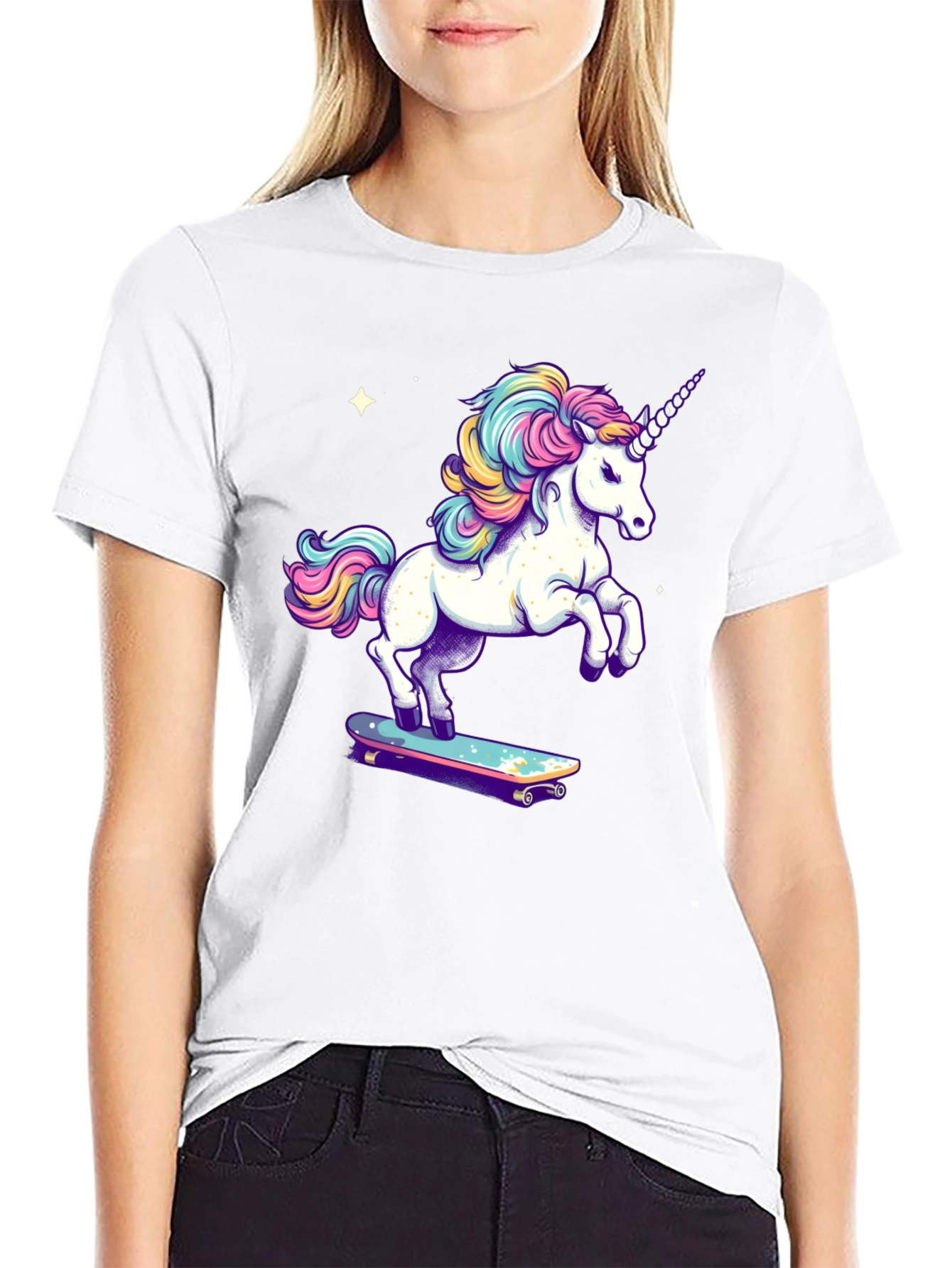 Show off your unique style with this cool black t-shirt featuring a vibrant design of a unicorn riding a skateboard. This eye-catching graphic tee is perfect for anyone who loves fantasy creatures, skateboarding, or just wants to add a touch of whimsy to their wardrobe. Made from a comfortable fabric, this shirt is great for everyday wear, casual outings, or as a fun gift for friends and family. The colorful unicorn illustration adds a playful and energetic vibe to the classic black tee.