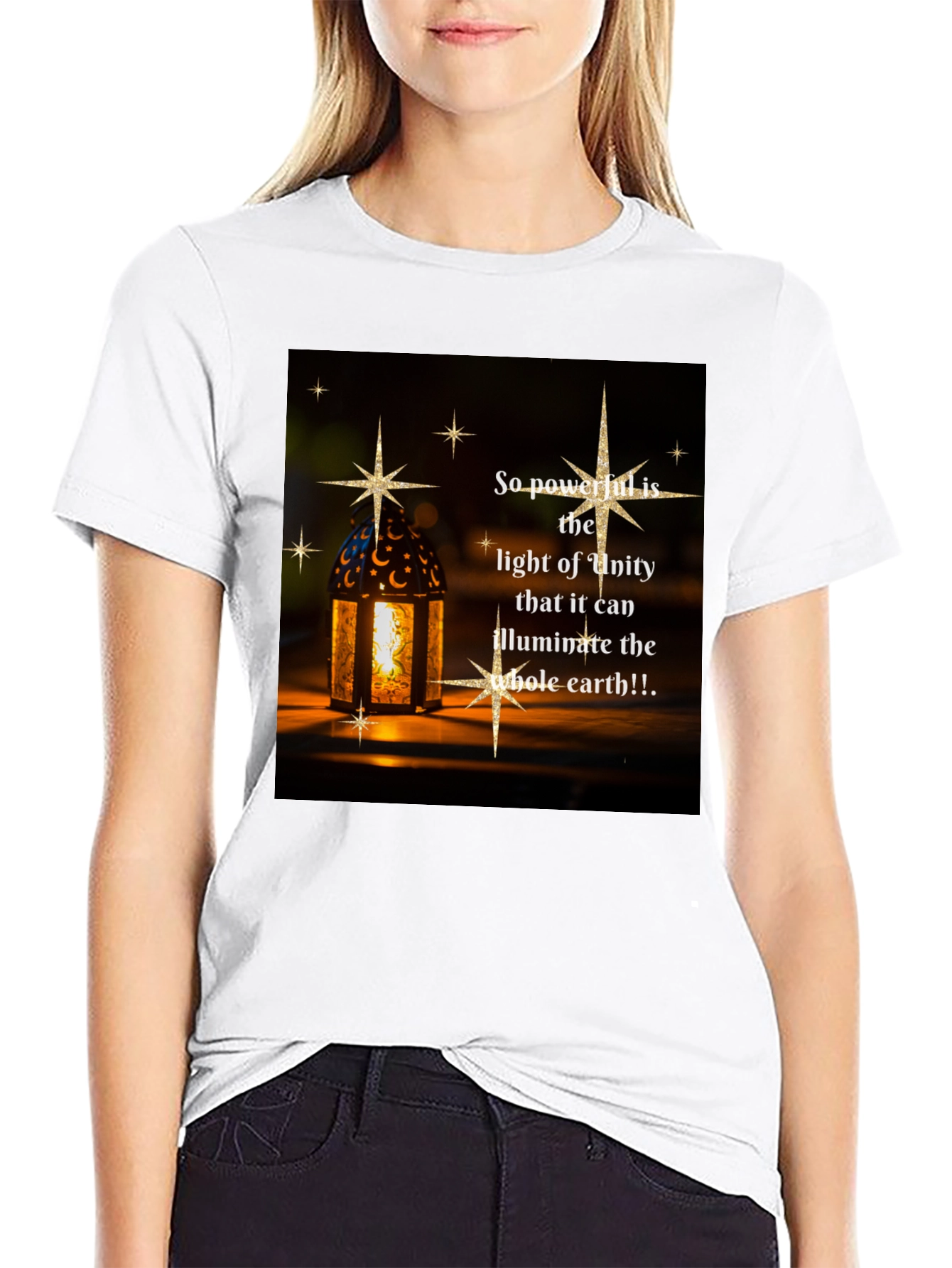 Embrace the power of unity with this unique graphic tee. The design features a beautifully rendered image of a lantern casting a warm, inviting glow, accompanied by the inspiring message: "So powerful is the light of unity that it can illuminate the whole earth!!". Crafted from a soft, comfortable black fabric, this shirt is perfect for everyday wear. Show your support for togetherness and spread positivity with this eye-catching tee. Its classic fit makes it a versatile addition to any wardrobe, while the meaningful message adds a touch of inspiration to your style. Wear it casually with jeans, or dress it up with a blazer for a more polished look.