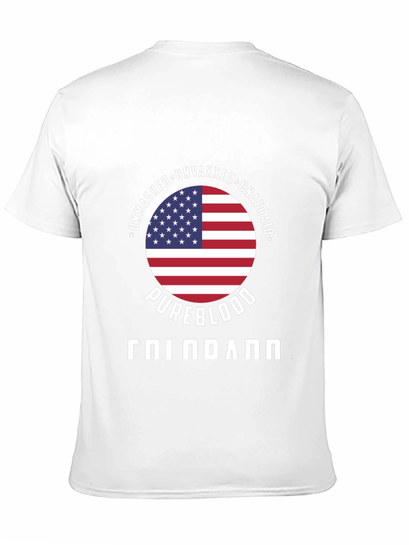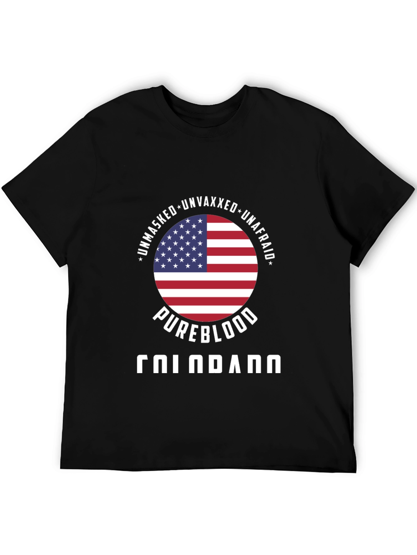 Make a bold statement with this black graphic tee! The design features a circular American flag emblem, emblazoned with 'Unmasked,' 'Unvaxxed,' and 'Unafraid' around the border and 'Pureblood' above 'NINDANN' in bold, white block letters. This classic fit tee is perfect for expressing your individual beliefs. Made from soft, breathable fabric, this t-shirt offers both comfort and durability for everyday wear. Pair it with jeans or shorts for a casual, confident look. Show your patriotic side while making a unique statement!