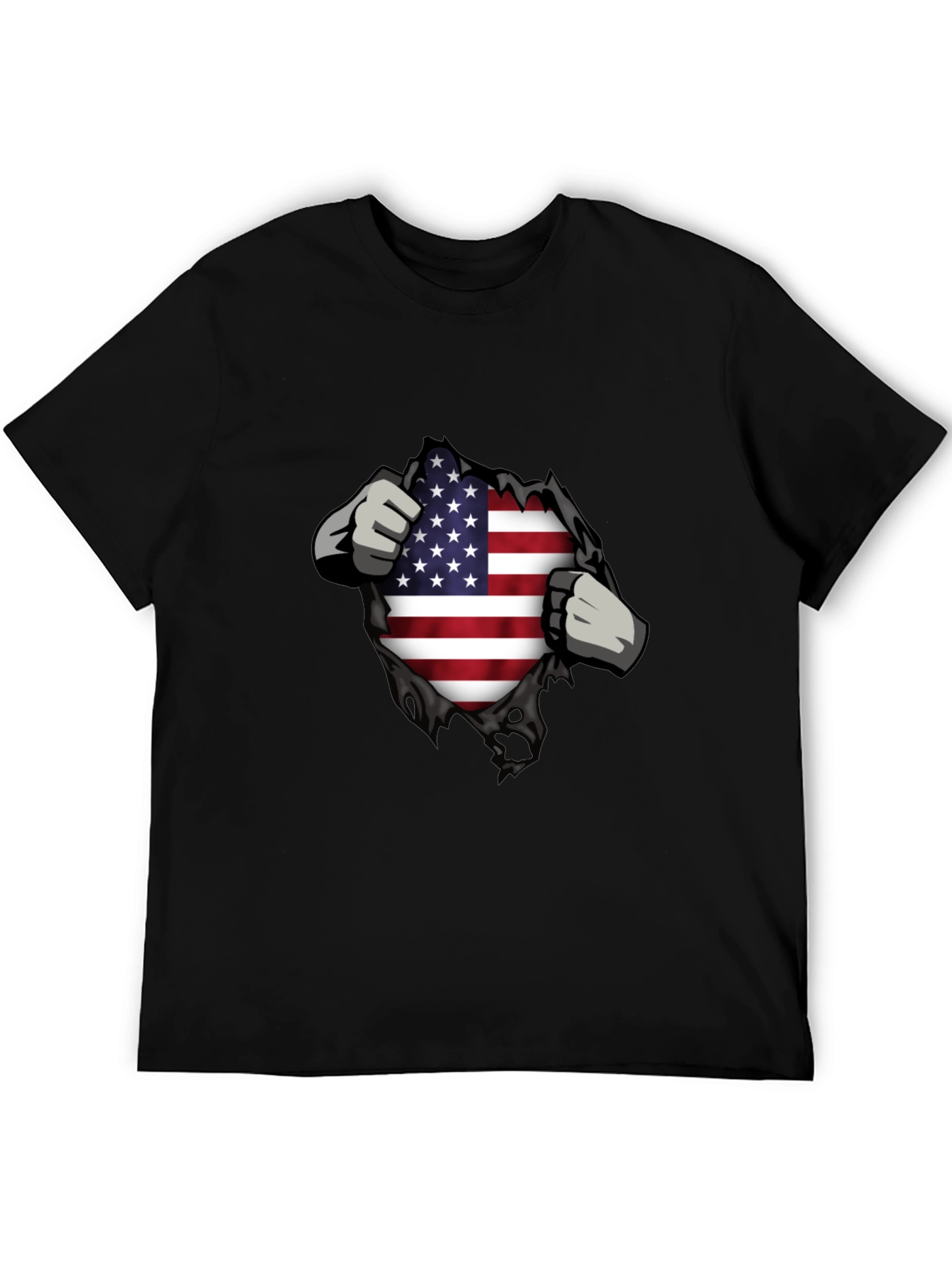 Show off your American pride with this eye-catching black t-shirt! Featuring a unique ripped design that reveals a vibrant USA flag, this tee is perfect for expressing your patriotism. The design includes stylized hands tearing open the shirt, adding a dynamic and edgy touch. Made from a comfortable-looking fabric, this shirt is suitable for casual wear, holidays like the 4th of July, or any day you want to showcase your love for the United States. Stand out from the crowd with this bold and expressive t-shirt!
