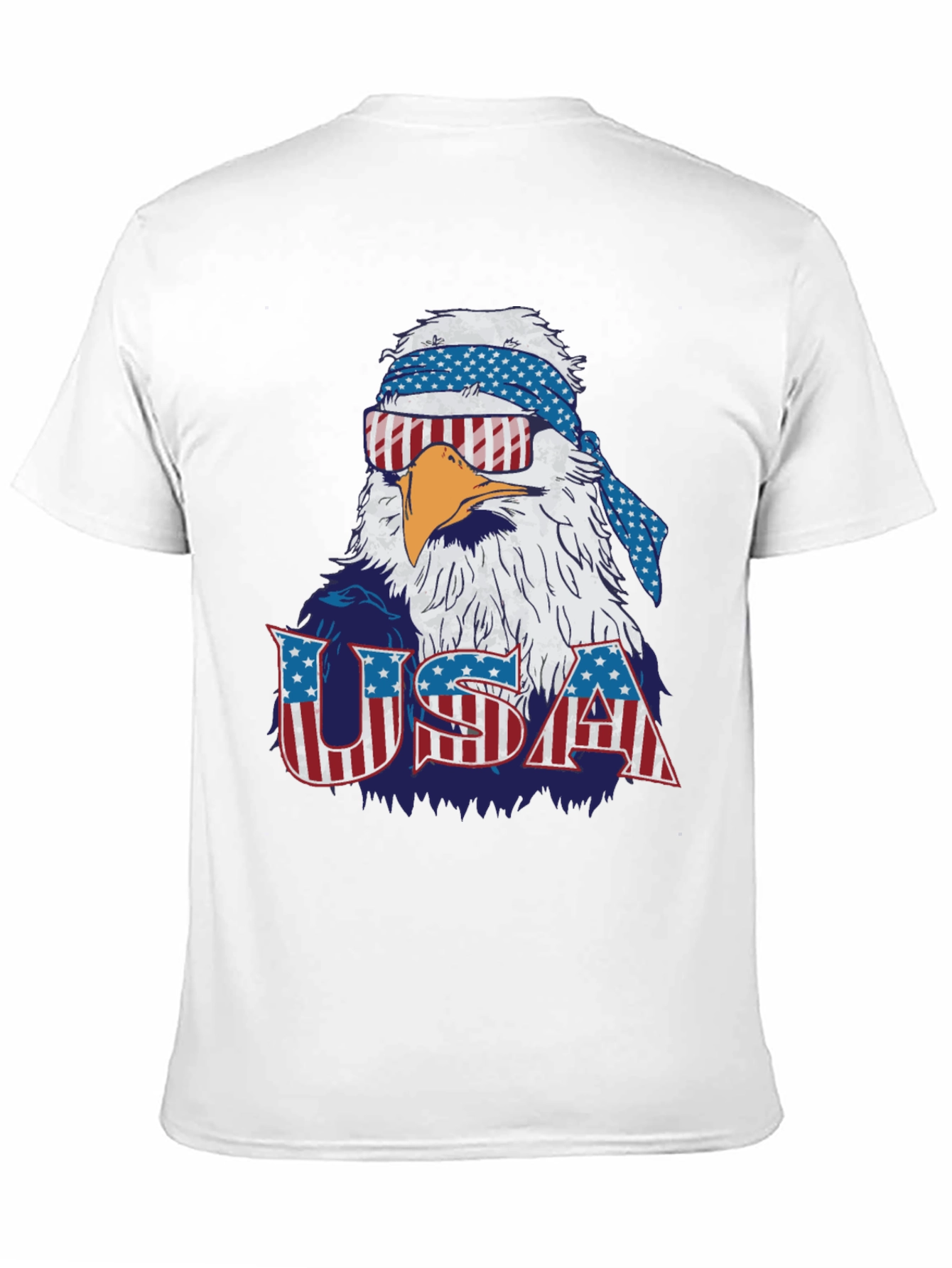 Show your American pride with this striking graphic t-shirt. Featuring a bold, stylized eagle design, complete with sunglasses and a patriotic bandana, this shirt is sure to turn heads. The letters "USA" are integrated into the design with an American flag pattern, adding to the shirt's unique appeal. Made from a comfortable, likely cotton-blend fabric, this black t-shirt is perfect for casual wear, 4th of July celebrations, or everyday style. The classic fit ensures a relaxed and flattering look. Wear your American spirit with this standout tee!