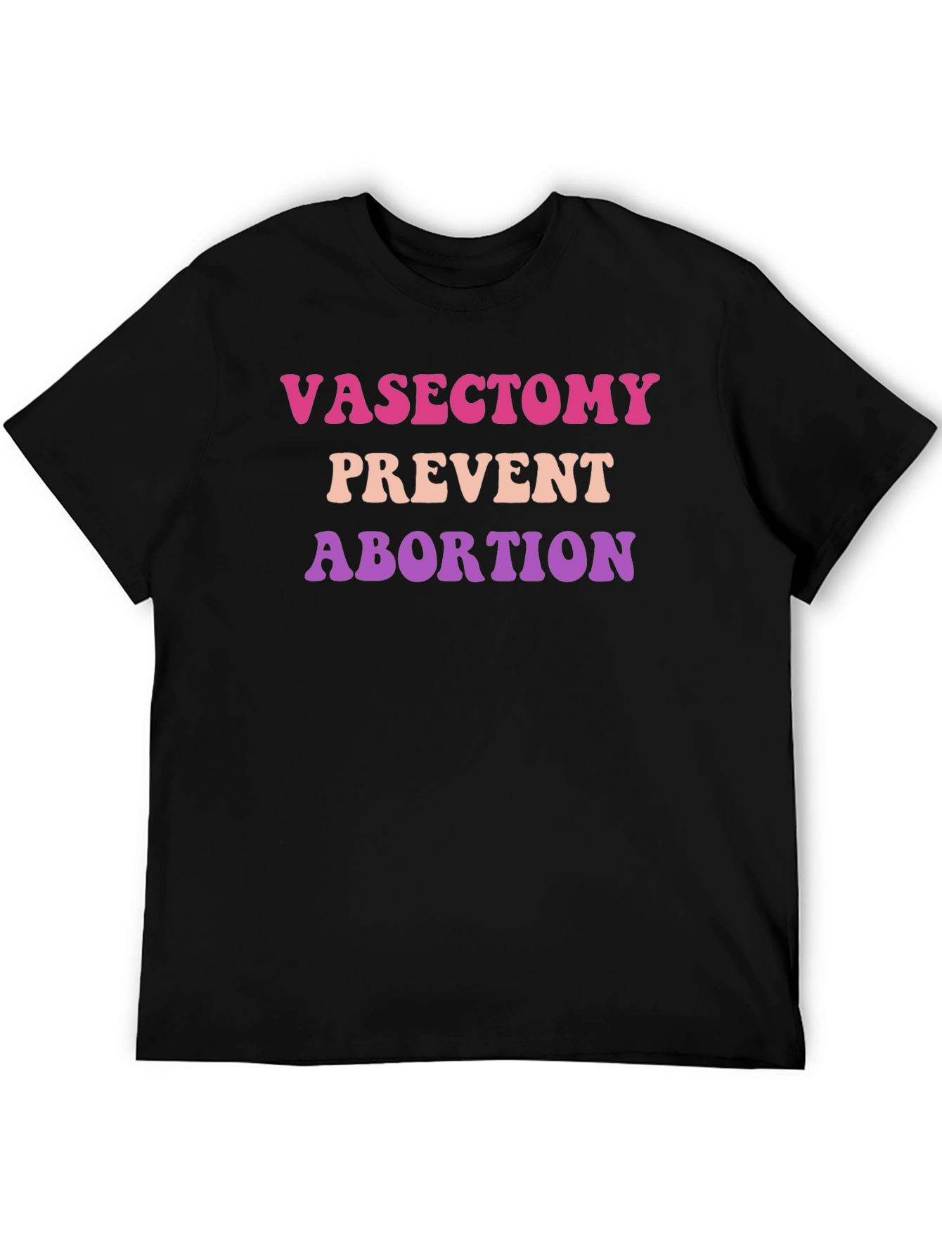 This eye-catching black t-shirt makes a bold statement. Featuring the words "VASECTOMY PREVENT ABORTION" in stacked, retro-inspired fonts with varying shades of pink and purple, the design is both attention-grabbing and thought-provoking. The shirt appears to be made from a comfortable, breathable cotton blend, perfect for everyday wear. Its classic fit makes it suitable for a variety of body types. Wear it to spark conversations, show your support for reproductive rights, or simply express your unique sense of humor. A perfect gift for the socially conscious and those with a quirky style.
