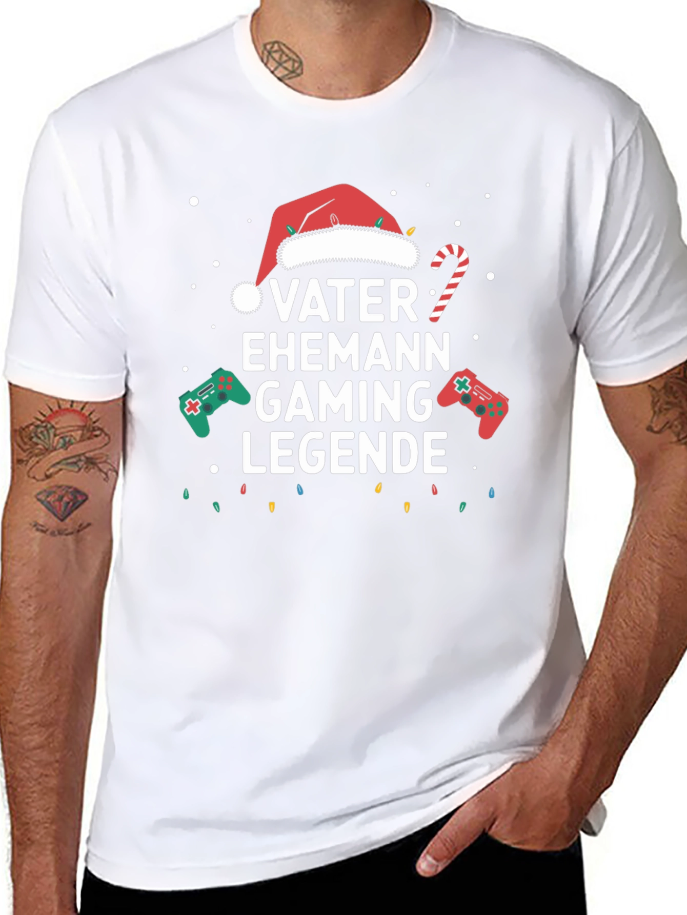 This stylish black t-shirt features a festive and fun design. The print includes a Santa hat, a candy cane, and gaming controllers, alongside the German words "VATER Ehemann Gaming Legende." The design is further embellished with colorful Christmas lights, adding to the holiday spirit. Made from comfortable material, this shirt is ideal for casual wear during the Christmas season. It’s perfect for gamers who are also fathers and husbands, letting them showcase their passions with festive cheer. This unique tee makes a great gift for the gaming dad in your life.