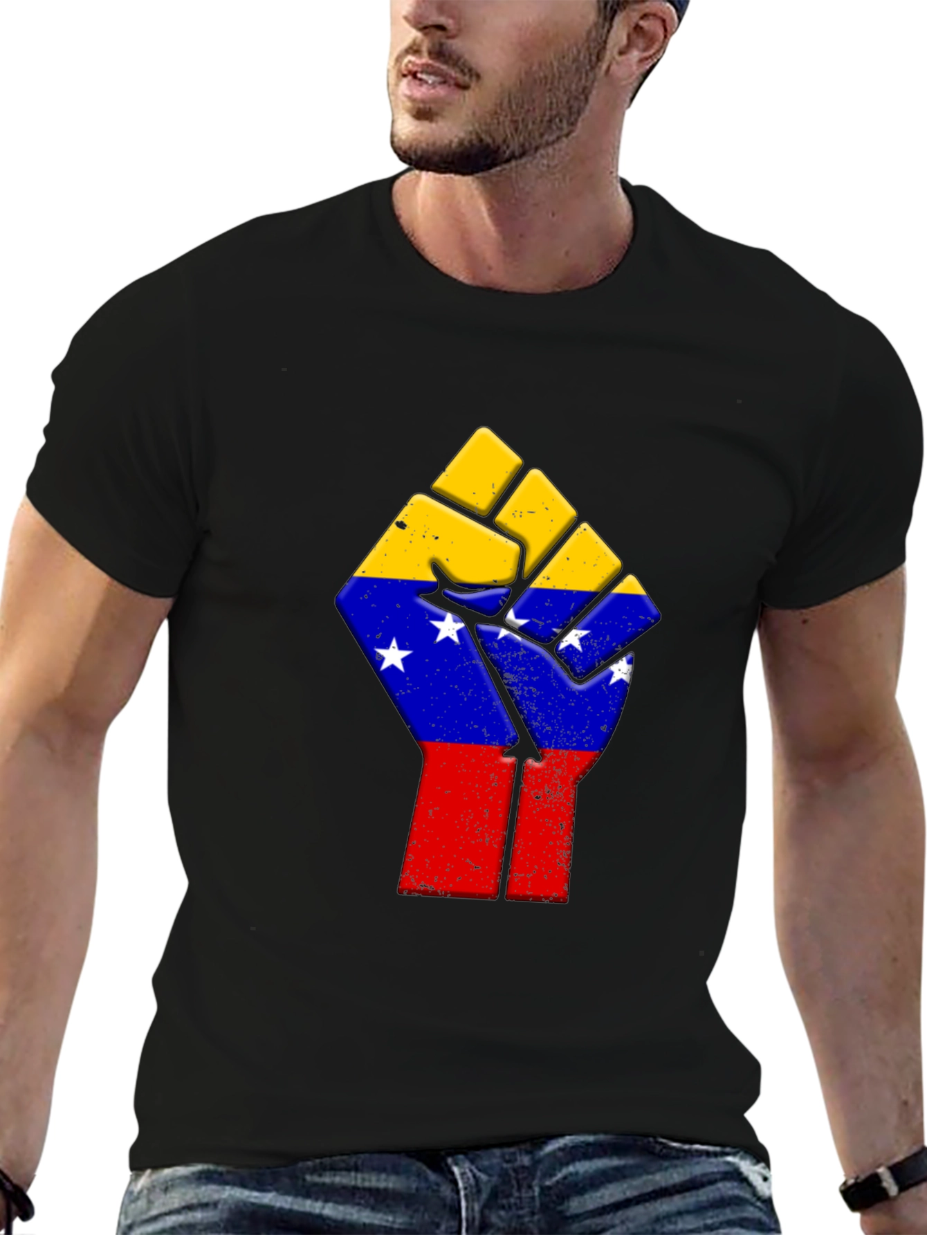 Show your Venezuelan pride with this bold and unique t-shirt. Featuring a powerful fist design emblazoned with the colors and stars of the Venezuelan flag, this shirt makes a statement. The design is printed on a classic black tee, made from a soft and comfortable fabric blend that's perfect for everyday wear. Wear it to cultural events, rallies, or just to show off your heritage. This shirt is sure to turn heads and spark conversation. It's a perfect way to express your love for Venezuela in style. Get yours today and represent!