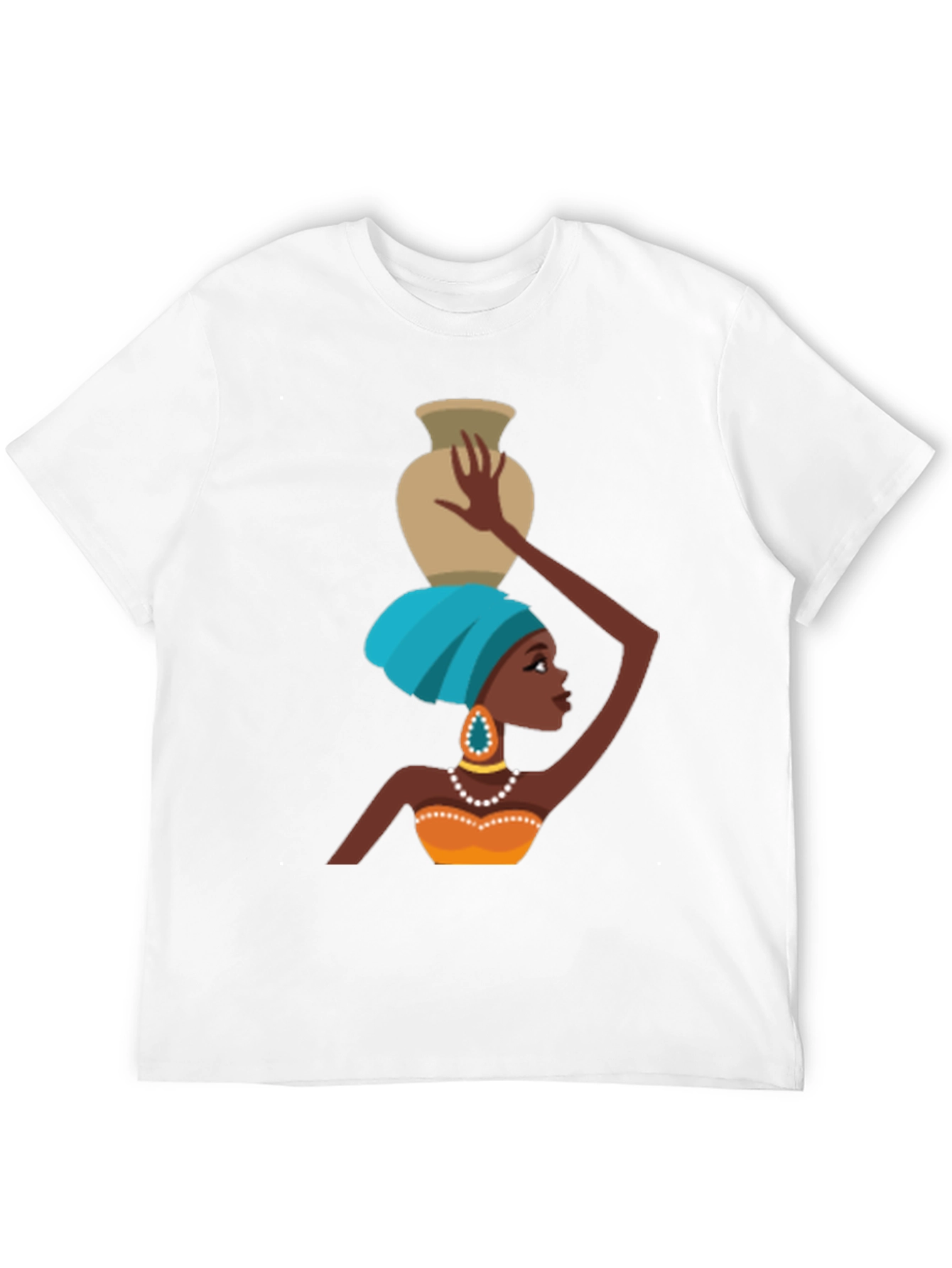 Show off your unique style with this eye-catching graphic t-shirt! The design features a stylized illustration of an African woman elegantly balancing a pot on her head. She is adorned with a blue headwrap, teardrop earring, and pearl necklace. The striking image on a black background makes for a modern and bold statement piece. Made from a comfortable fabric blend, this tee is perfect for everyday wear or a casual night out. Pair it with jeans, shorts, or a skirt for a fashionable look that celebrates cultural pride and artistic flair. A must-have addition to any wardrobe!