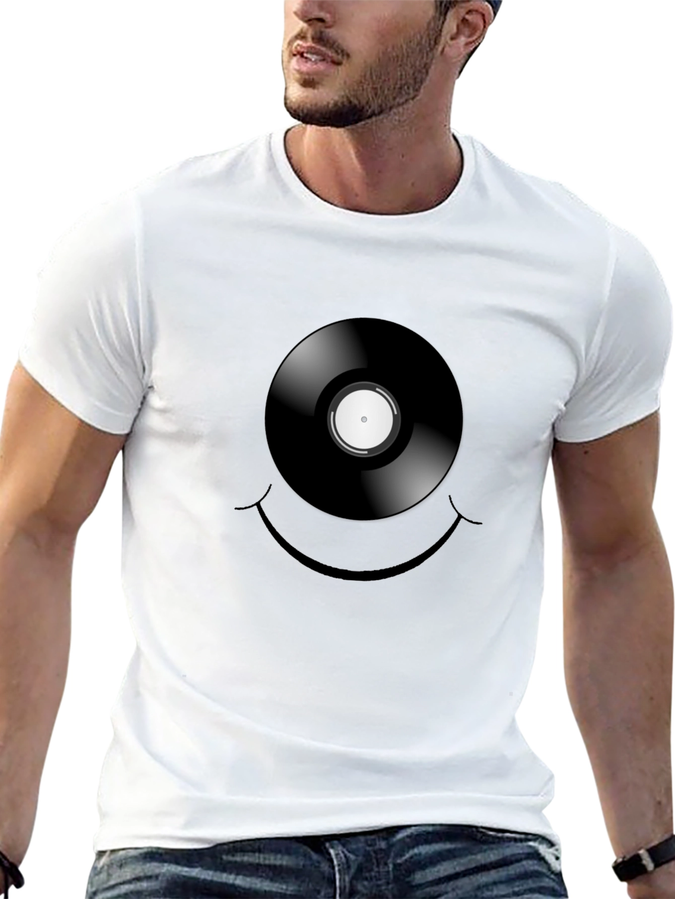 Rock a retro vibe with this stylish black t-shirt! Featuring a bold graphic print of a vinyl record integrated into a playful smiley face design, this tee is perfect for music lovers and anyone who appreciates unique fashion. The design is eye-catching and conversation-starting. Crafted from soft, breathable fabric, it ensures all-day comfort, whether you're rocking out at a concert, hanging out with friends, or simply expressing your love for vintage tunes. Add a touch of musical charm to your everyday wardrobe with this standout graphic tee.